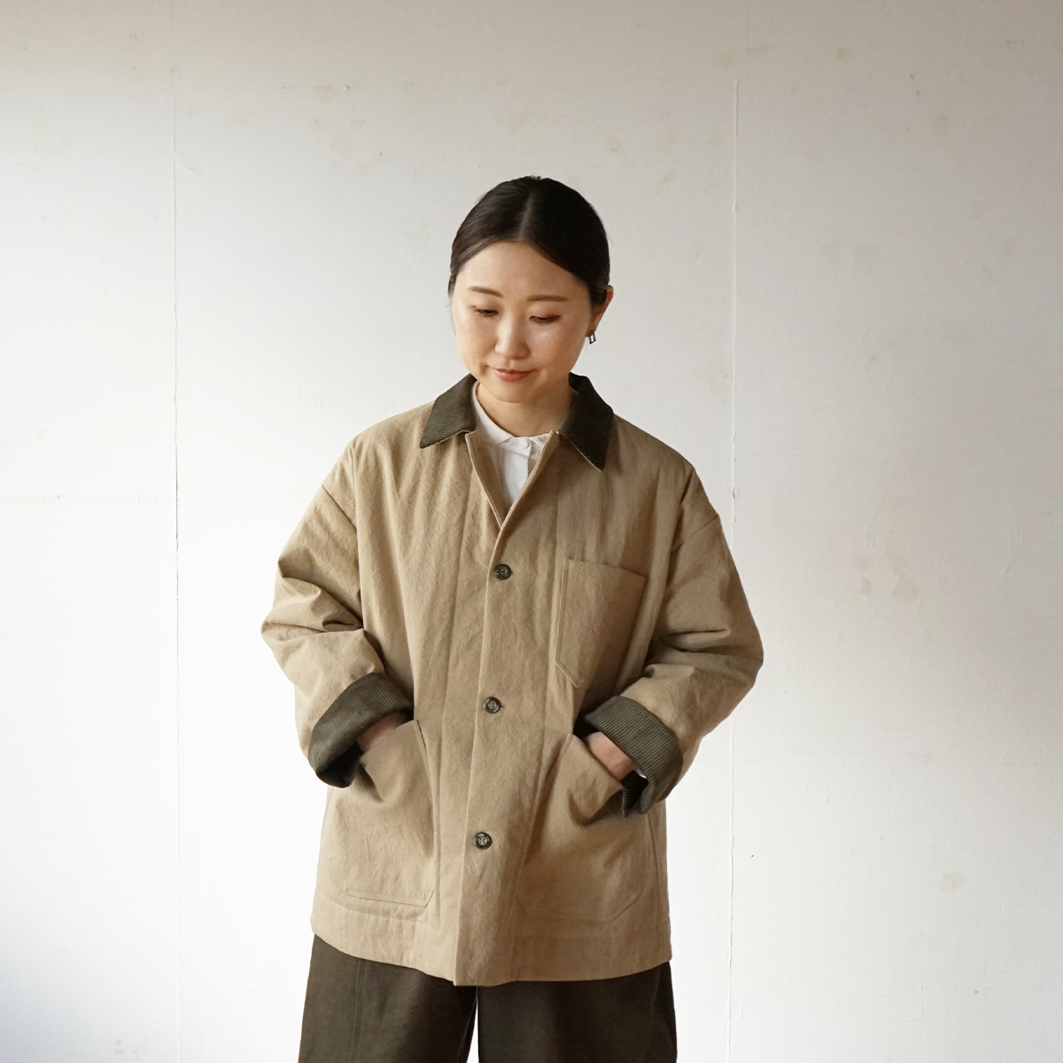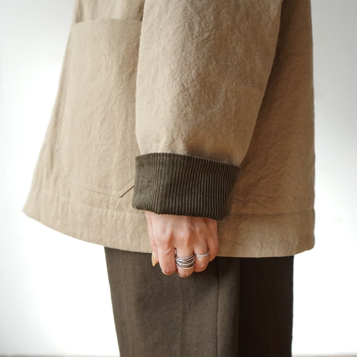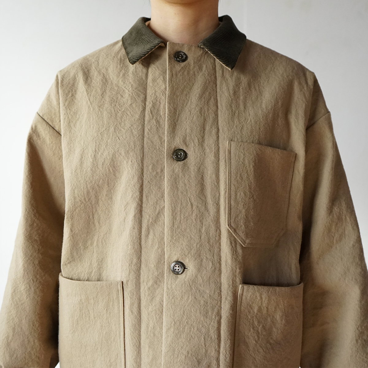 襟と袖口はコーデュロイを使って異素材の組み合わせに。視覚的にも温かみを出しました。