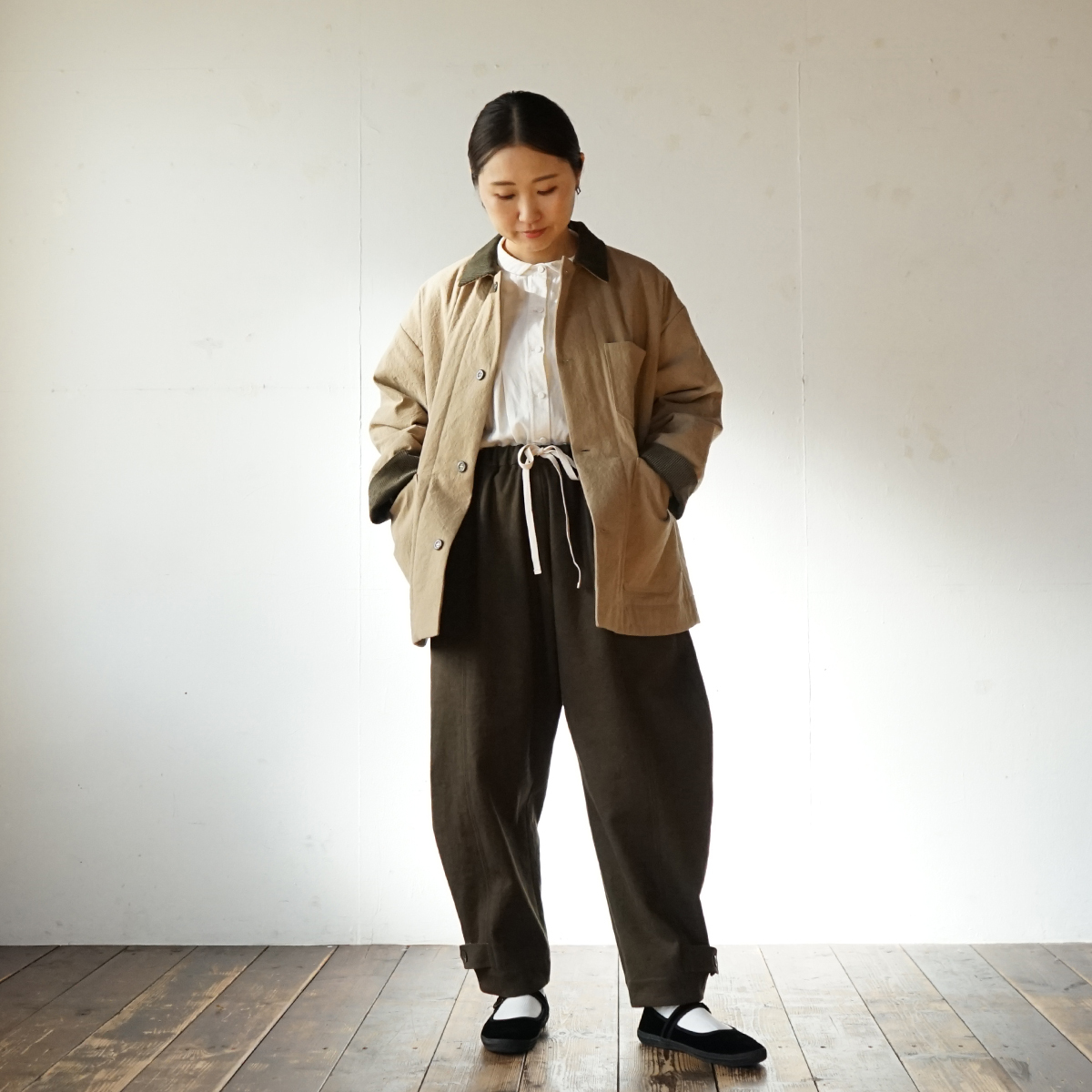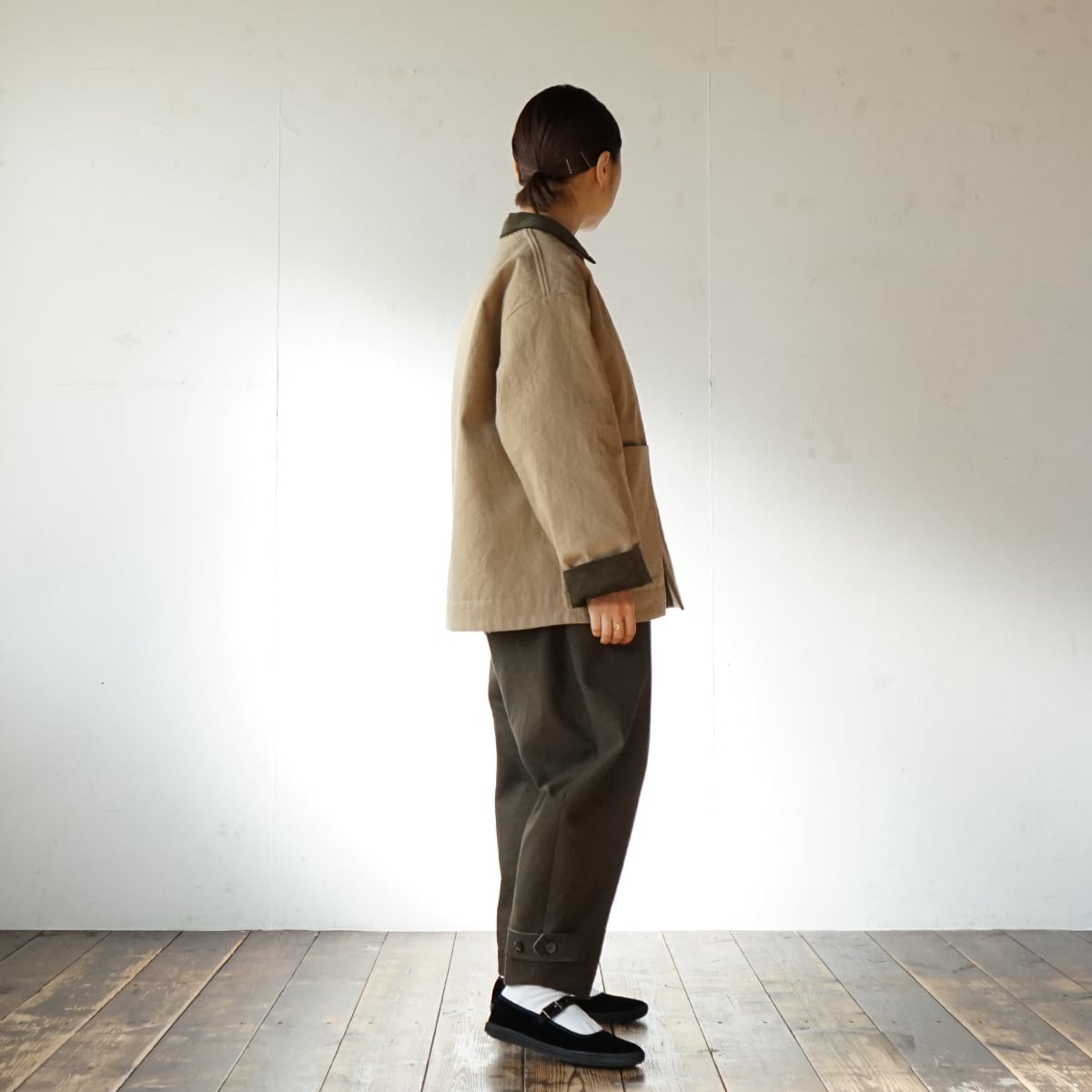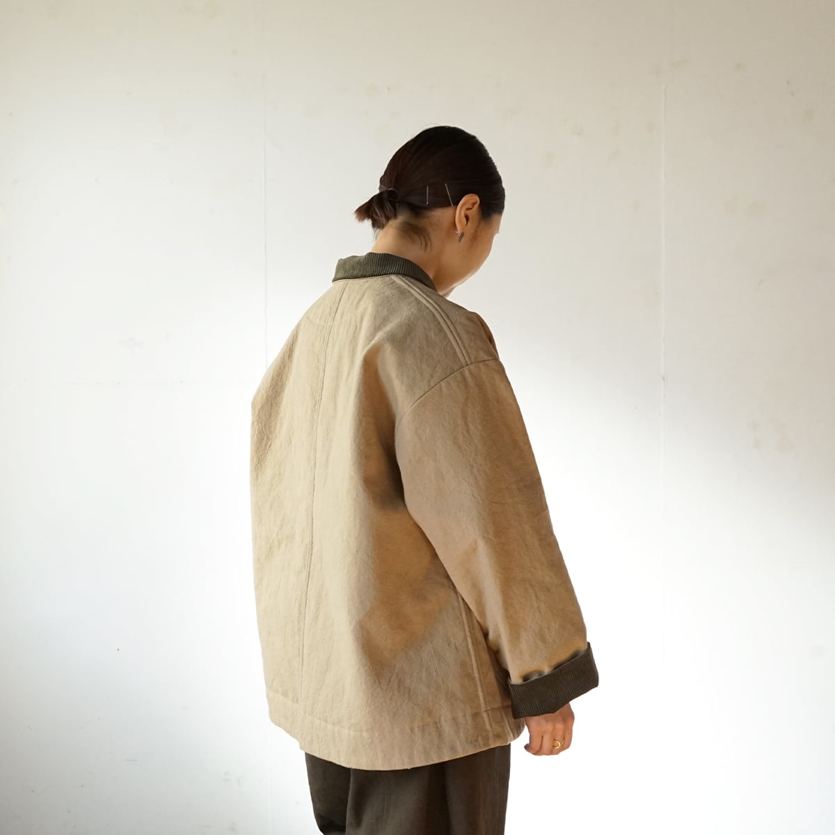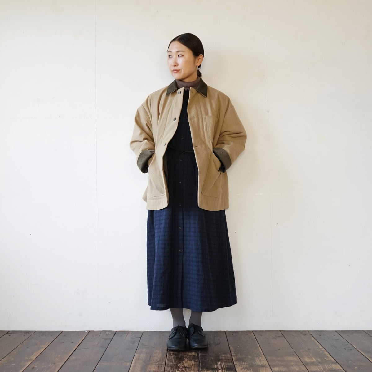 襟と袖口はコーデュロイを使って異素材の組み合わせに。視覚的にも温かみを出しました。