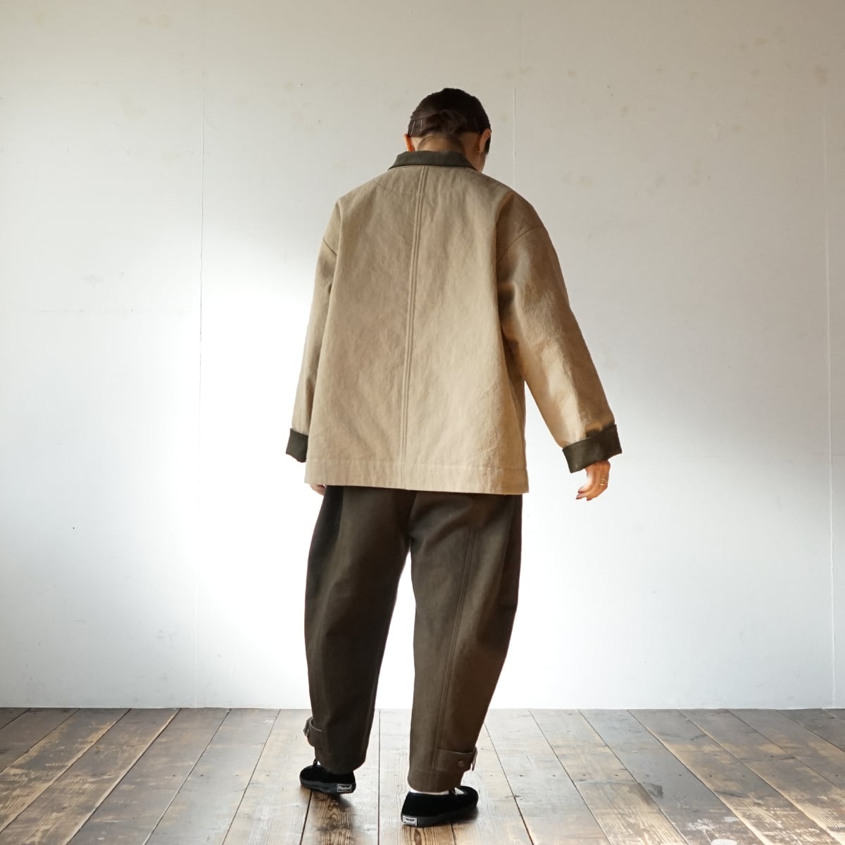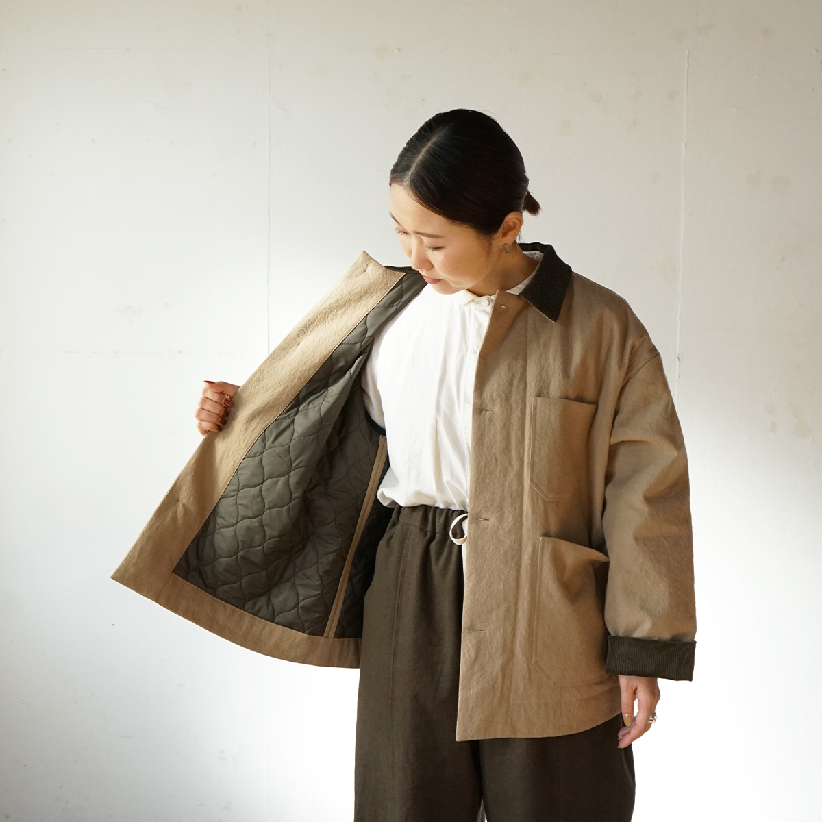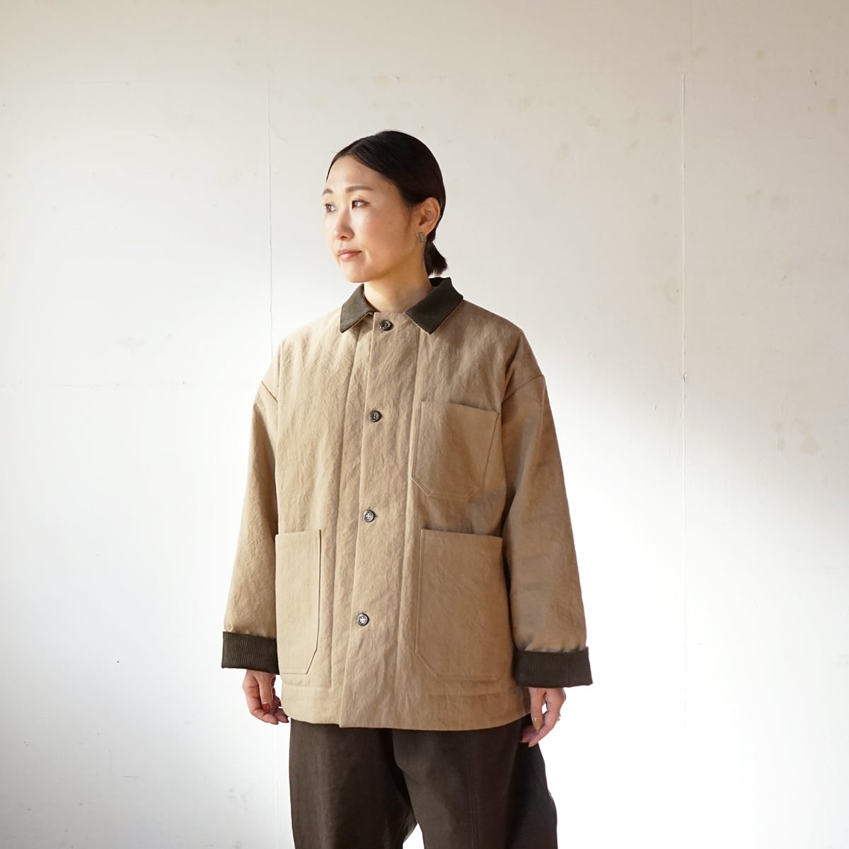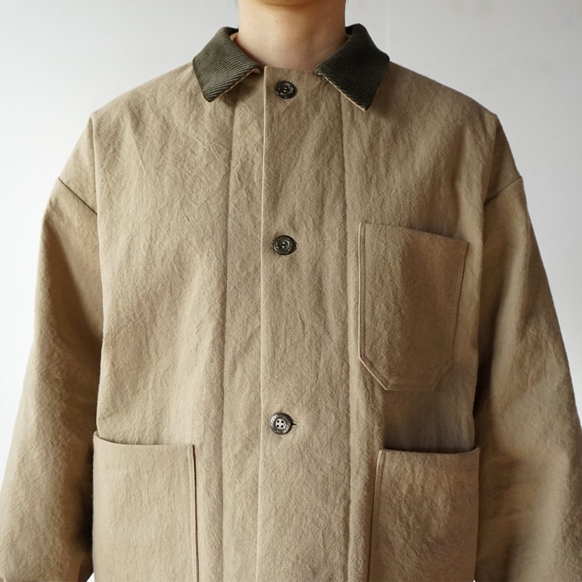 表地は目の詰まった中厚地の綿麻キャンバス。裏地は高密度に織られたタフタでポリエステルの中綿をサンドしたキルティング素材。どちらの素材も防風機能が優れていて衣服内の熱を逃しにくい構造です。真冬に使って頂けるショートコートとして制作しました。