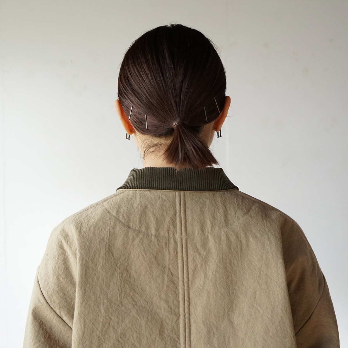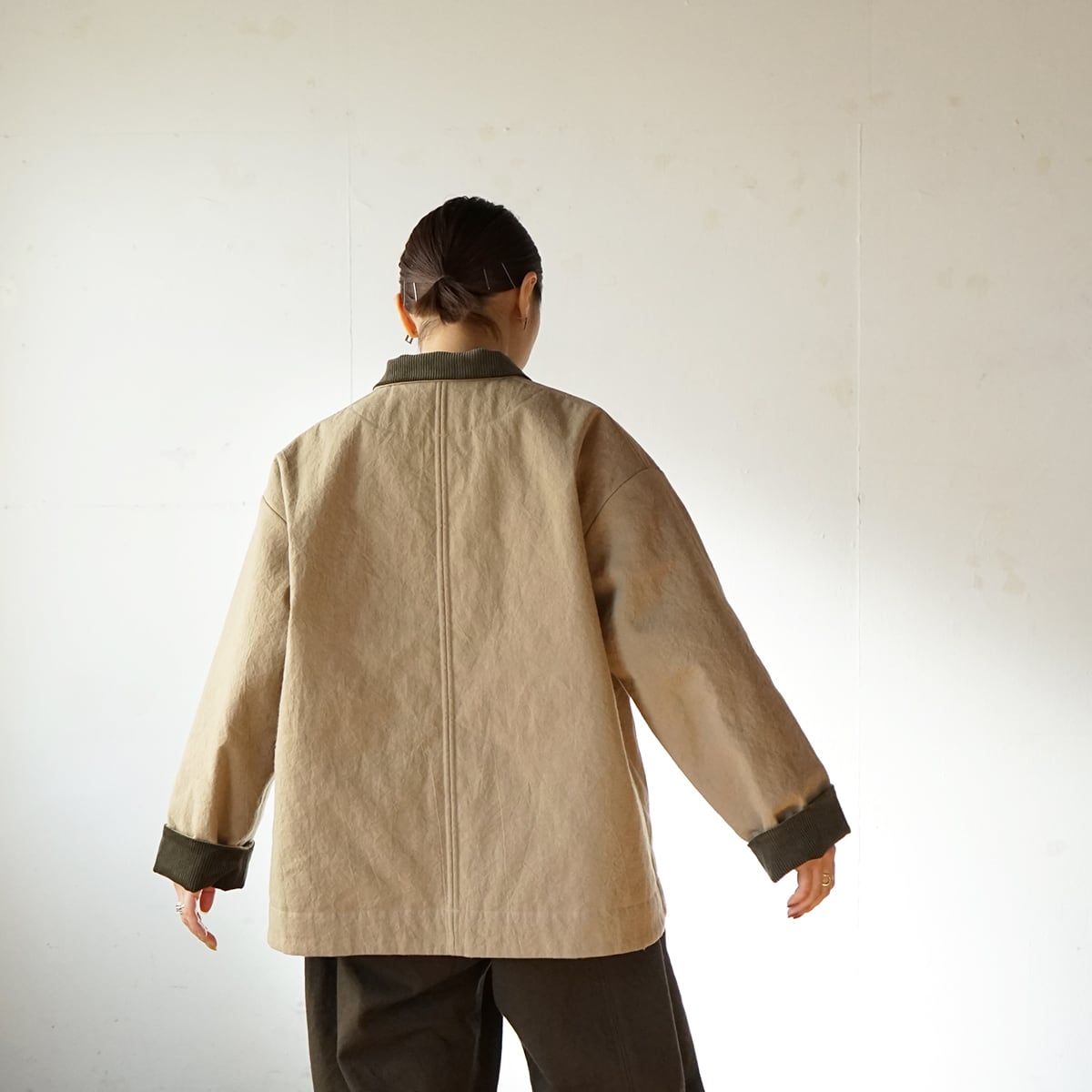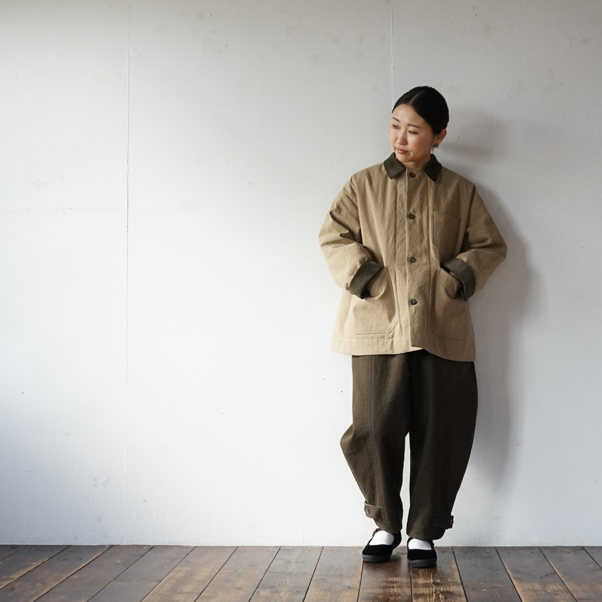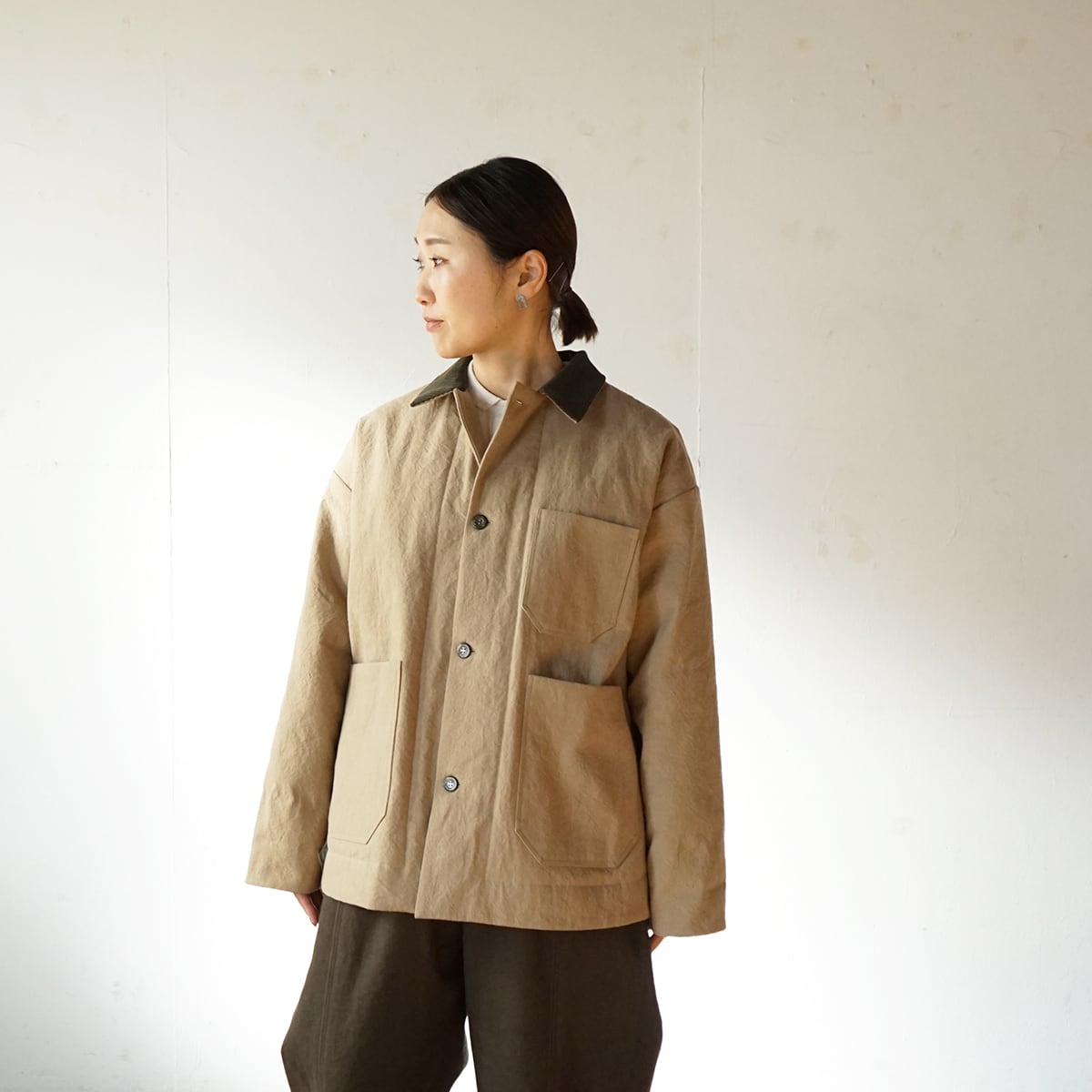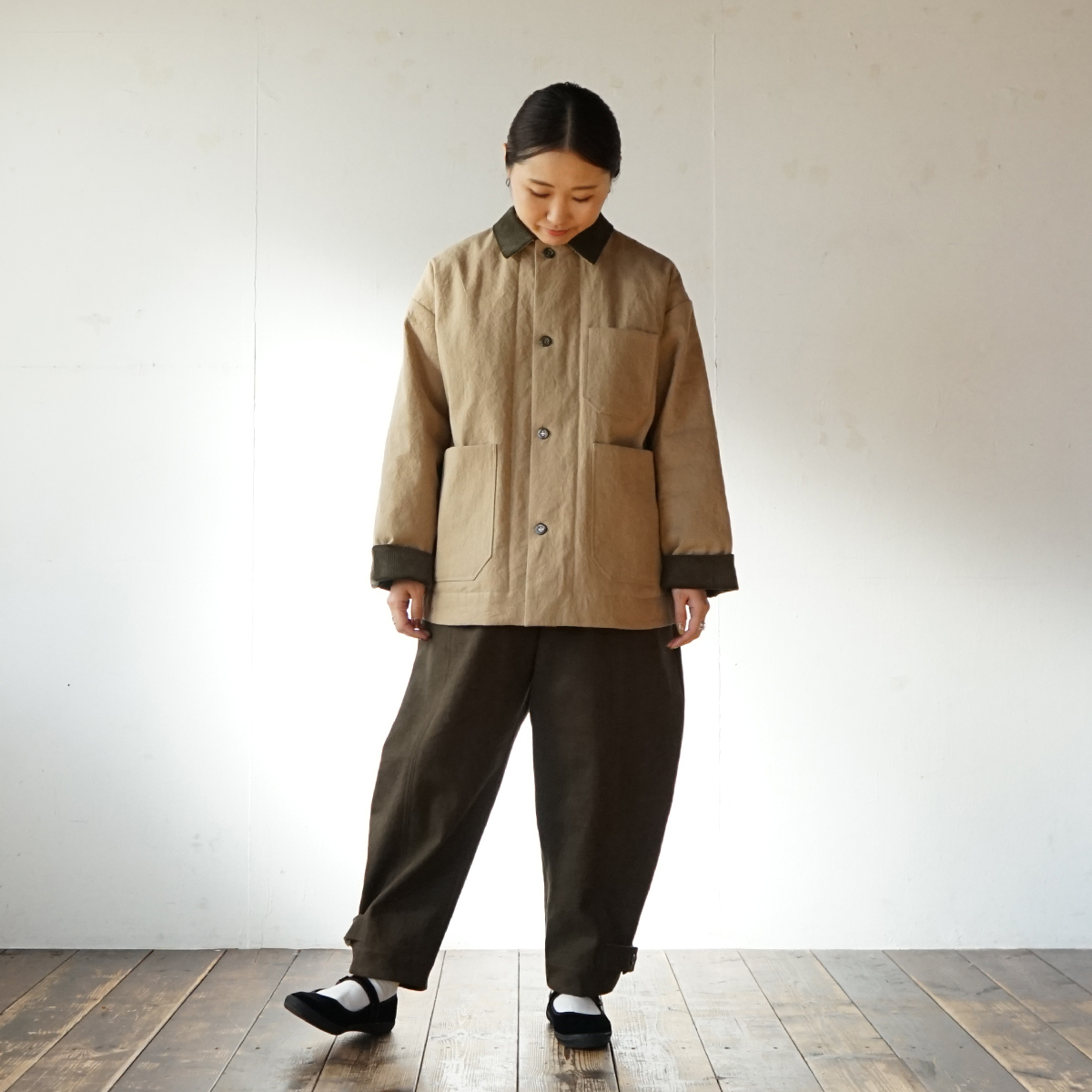 表地は目の詰まった中厚地の綿麻キャンバス。裏地は高密度に織られたタフタでポリエステルの中綿をサンドしたキルティング素材。どちらの素材も防風機能が優れていて衣服内の熱を逃しにくい構造です。真冬に使って頂けるショートコートとして制作しました。