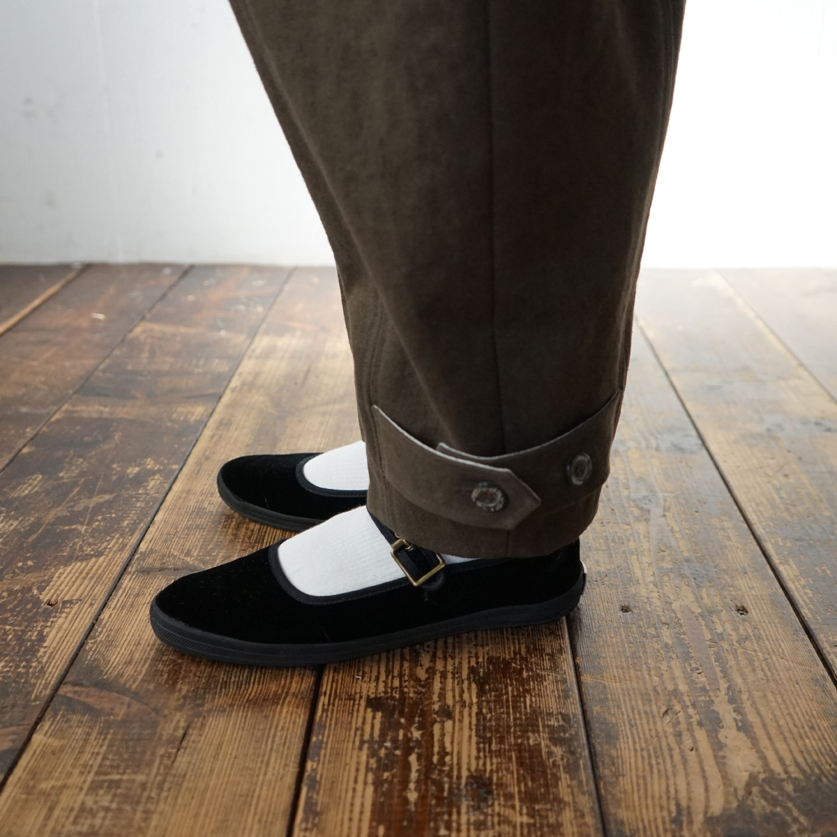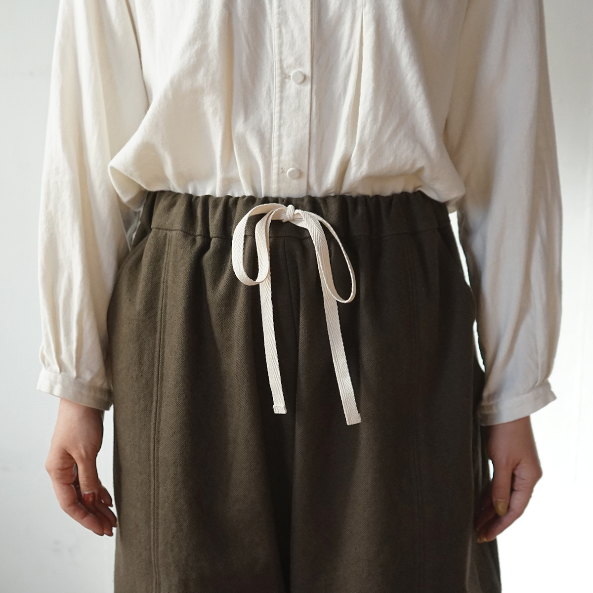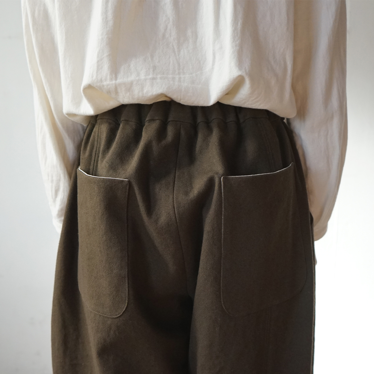 非常に緊密な綾織で、丈夫で肉厚のあるギャバジンという生地を使ってパンツを仕立てました。物理的に風を通しにくいので、タイツなどと合わせるとより暖かく着ていただけます。