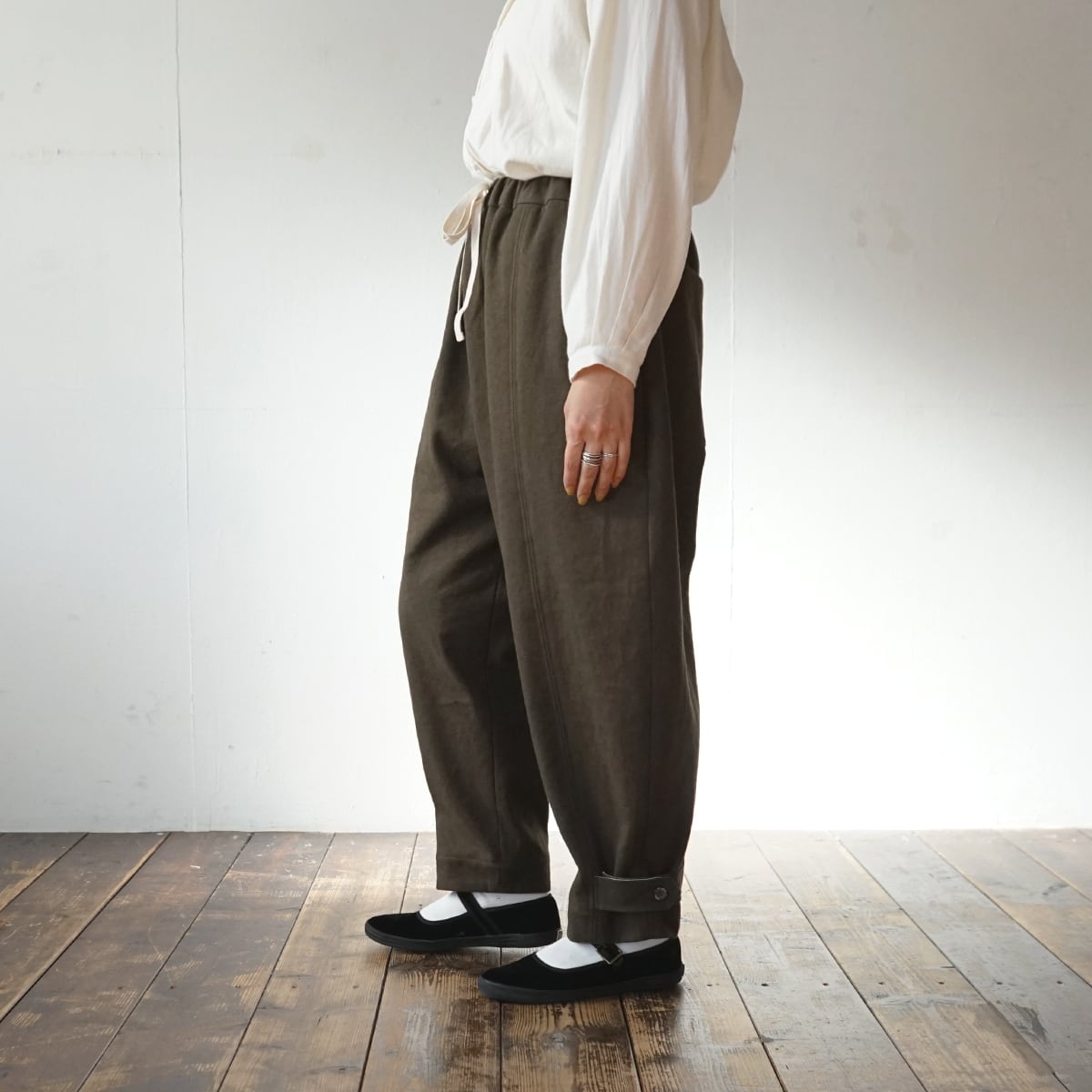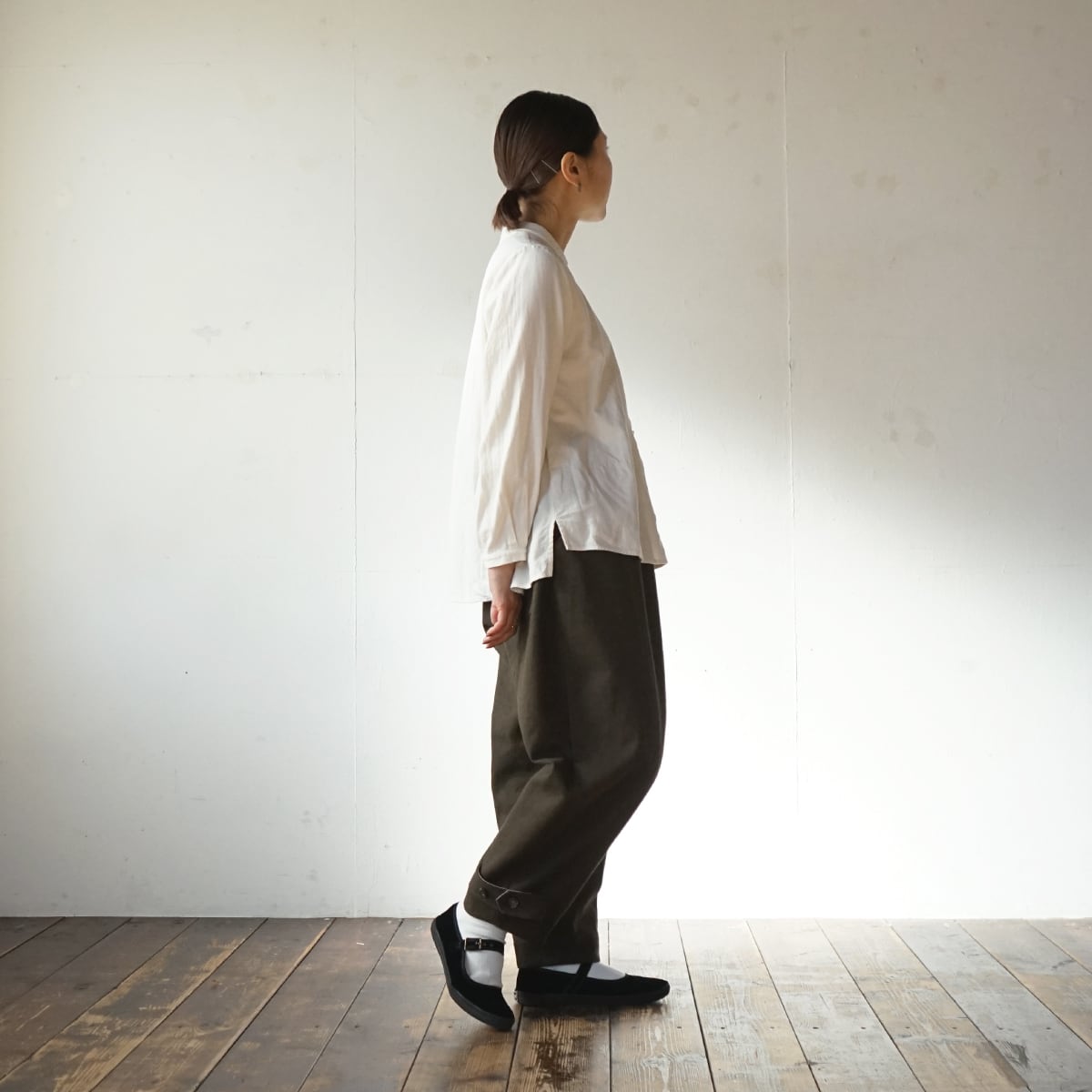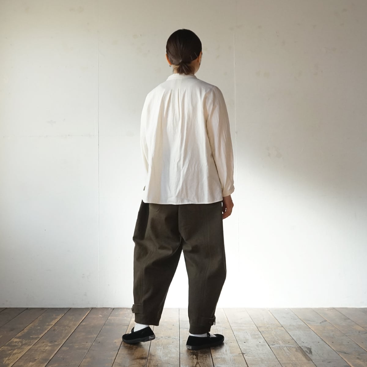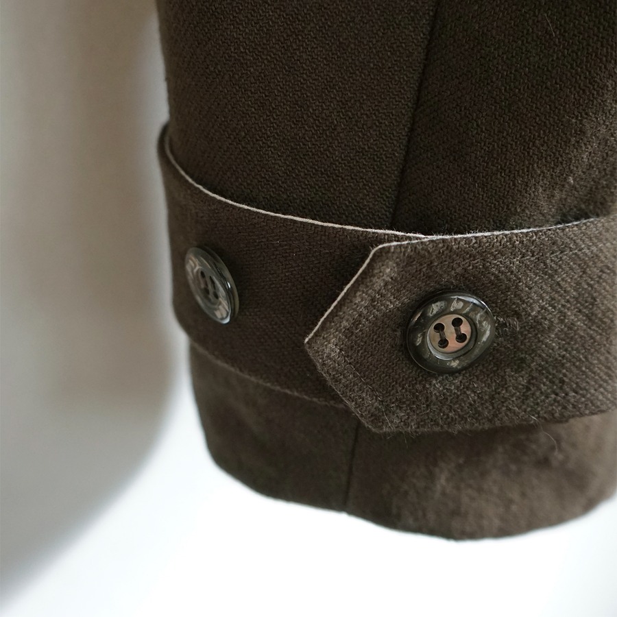 裾のタブをボタンで留めるディテールを施しています。ボタンを付け替えることで、さらに裾しぼみのシルエットになります。