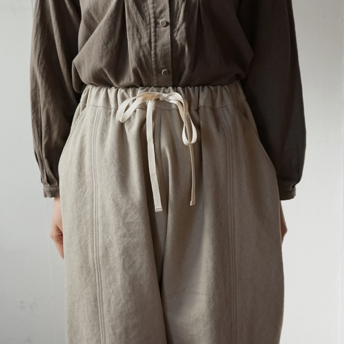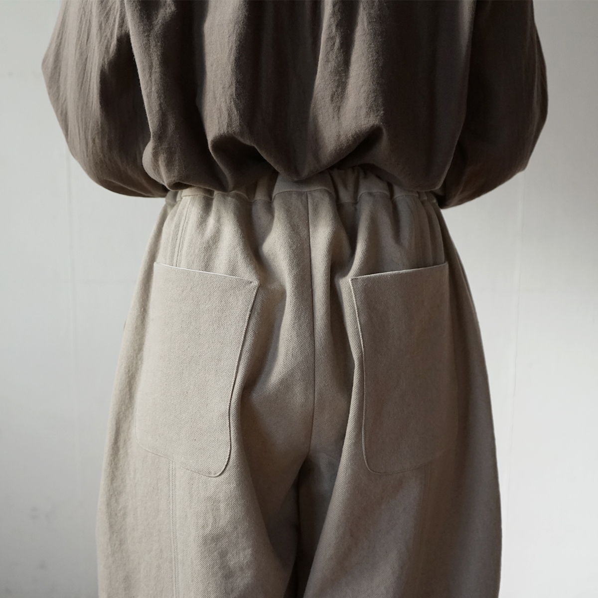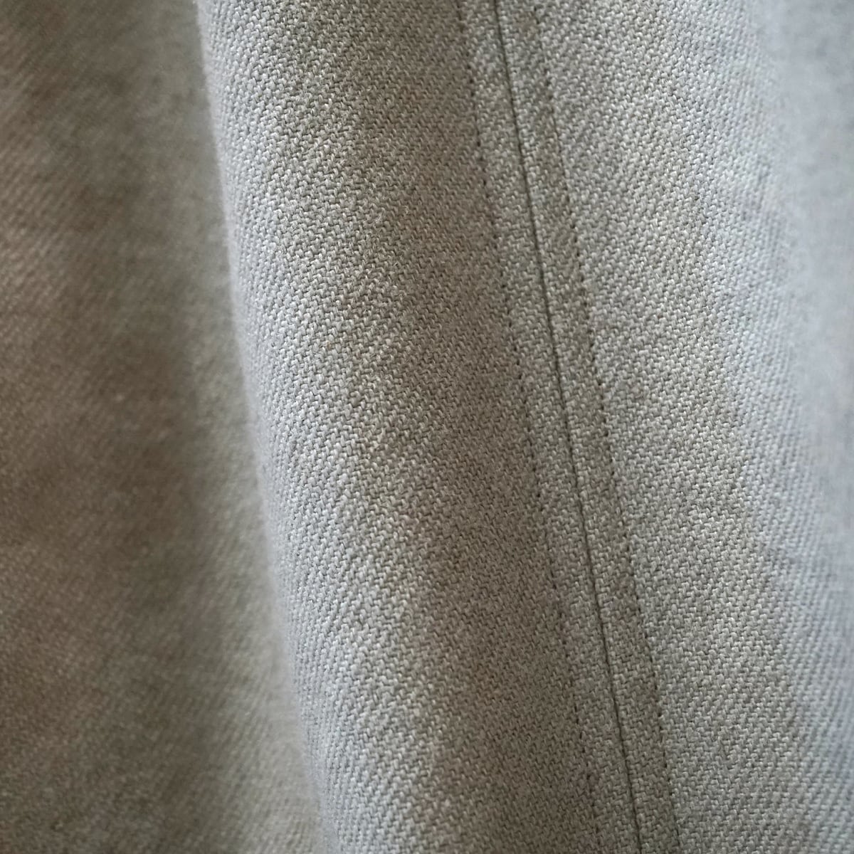 非常に緊密な綾織で、丈夫で肉厚のあるギャバジンという生地を使ってパンツを仕立てました。物理的に風を通しにくいので、タイツなどと合わせるとより暖かく着ていただけます。