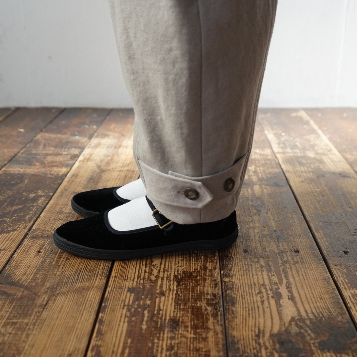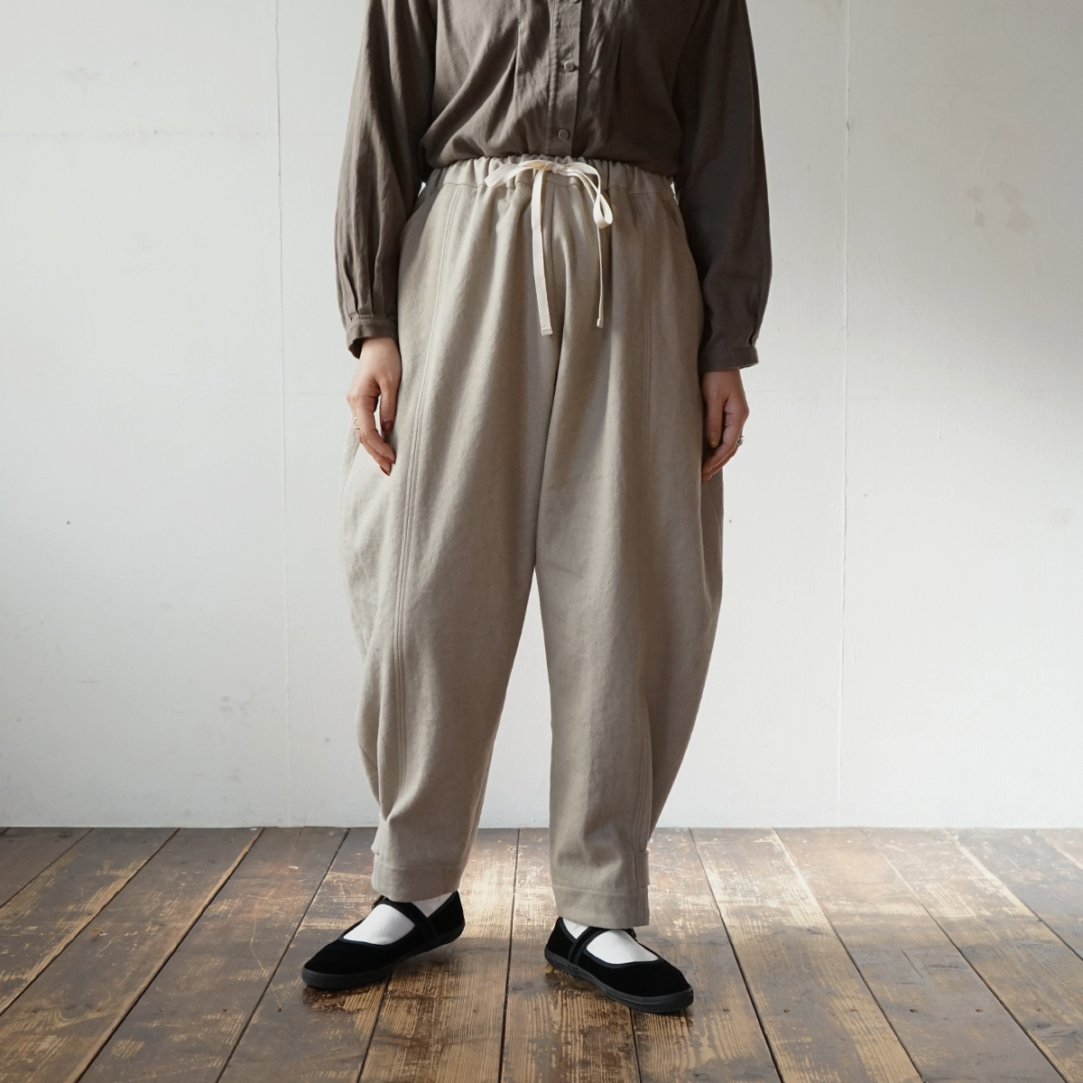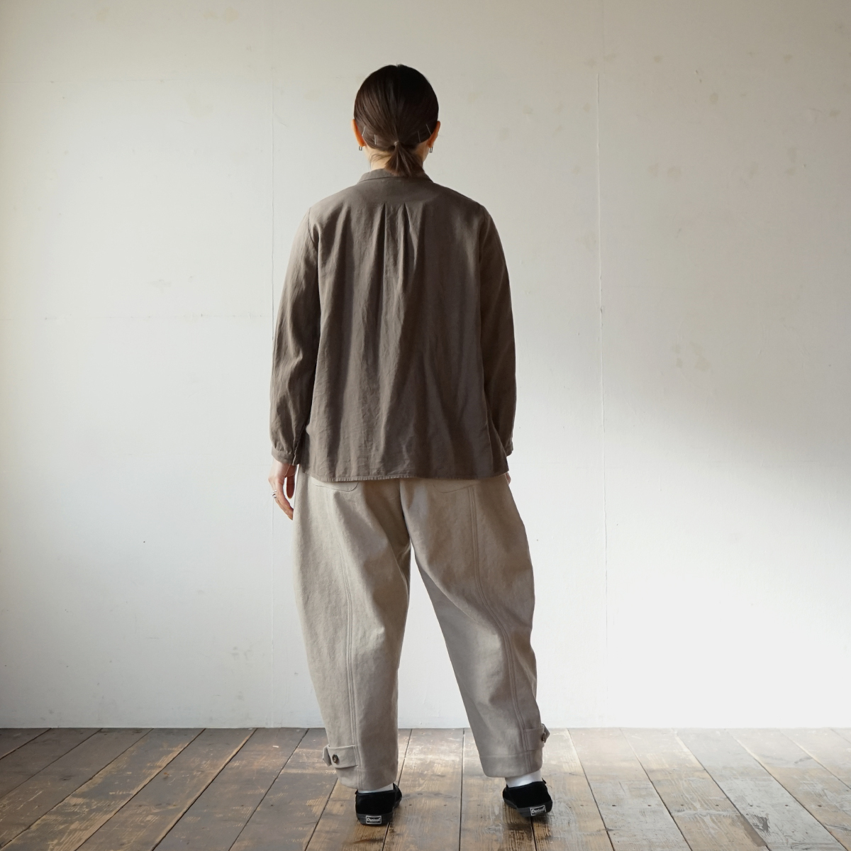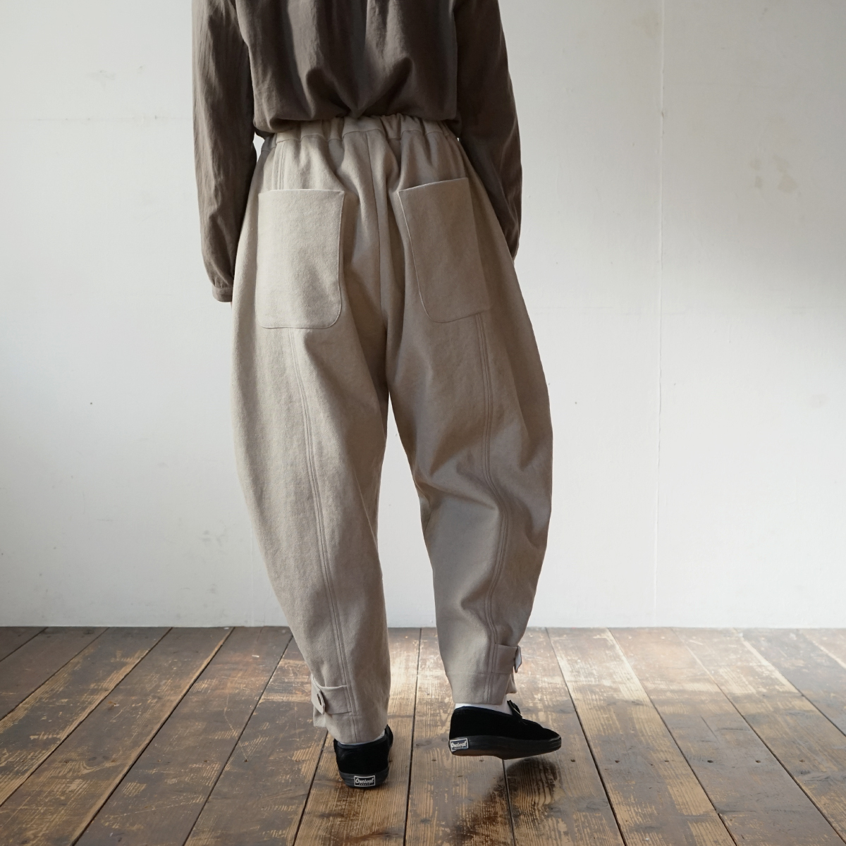 非常に緊密な綾織で、丈夫で肉厚のあるギャバジンという生地を使ってパンツを仕立てました。物理的に風を通しにくいので、タイツなどと合わせるとより暖かく着ていただけます。