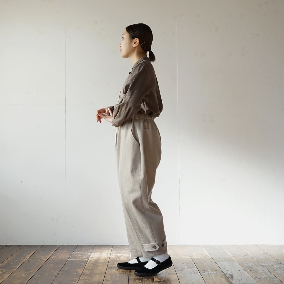 裾のタブをボタンで留めるディテールを施しています。ボタンを付け替えることで、さらに裾しぼみのシルエットになります。