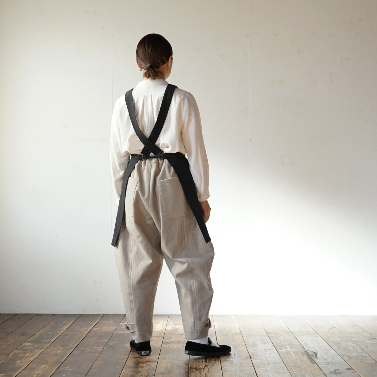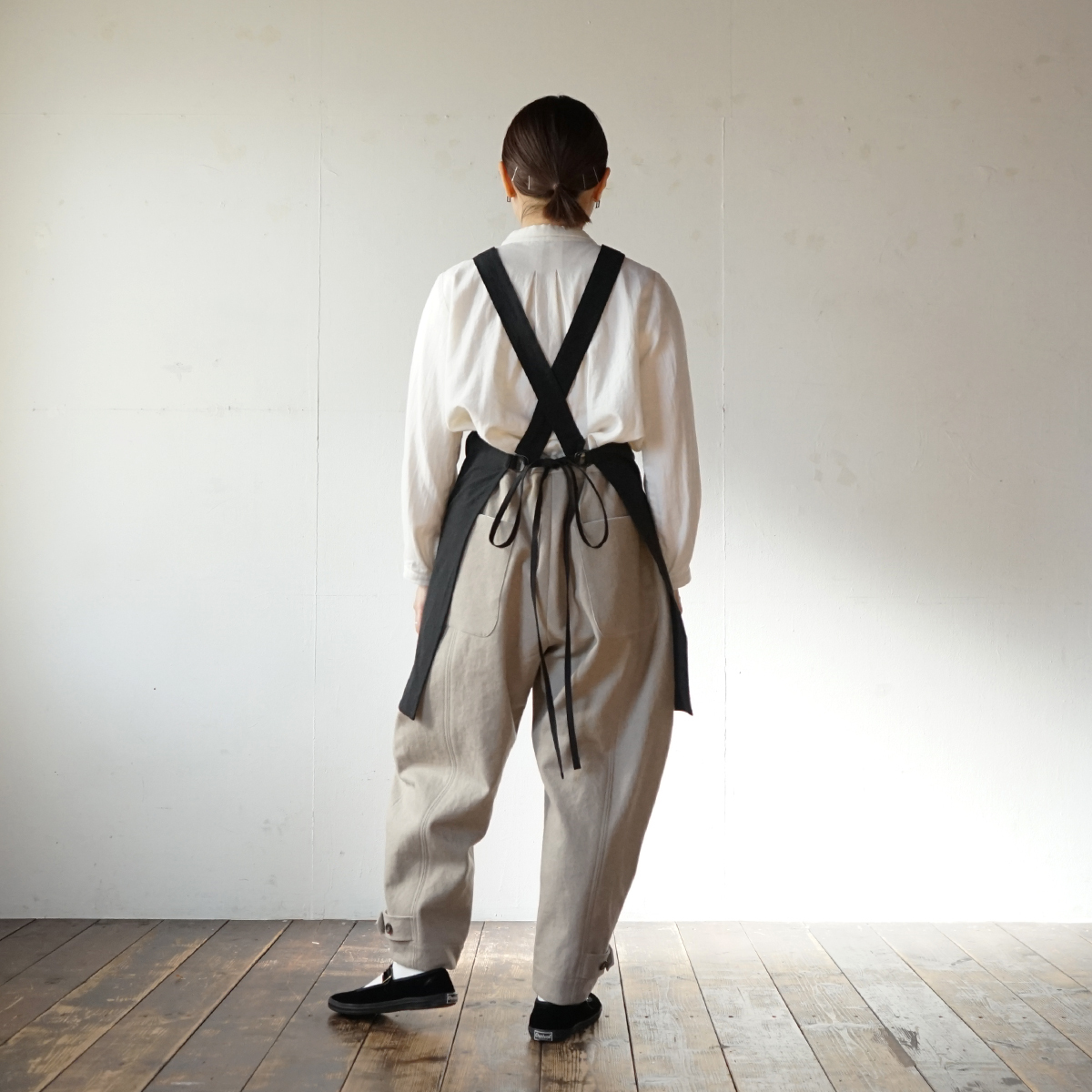 肩紐がズレ落ちにくくするために身頃はタンクトップ型にしました。こうする事で見た目もワークと日常着の中間くらいの雰囲気になりました。