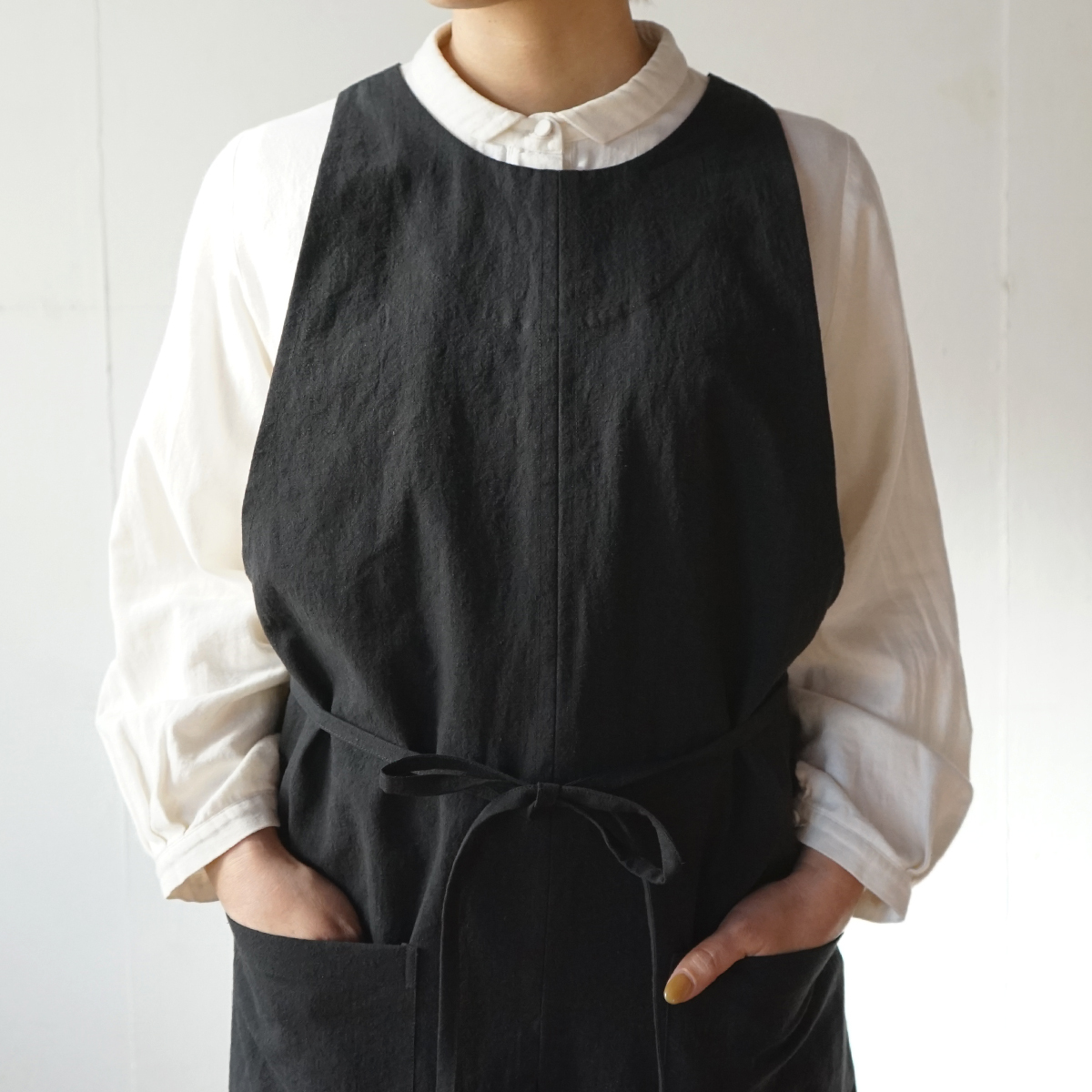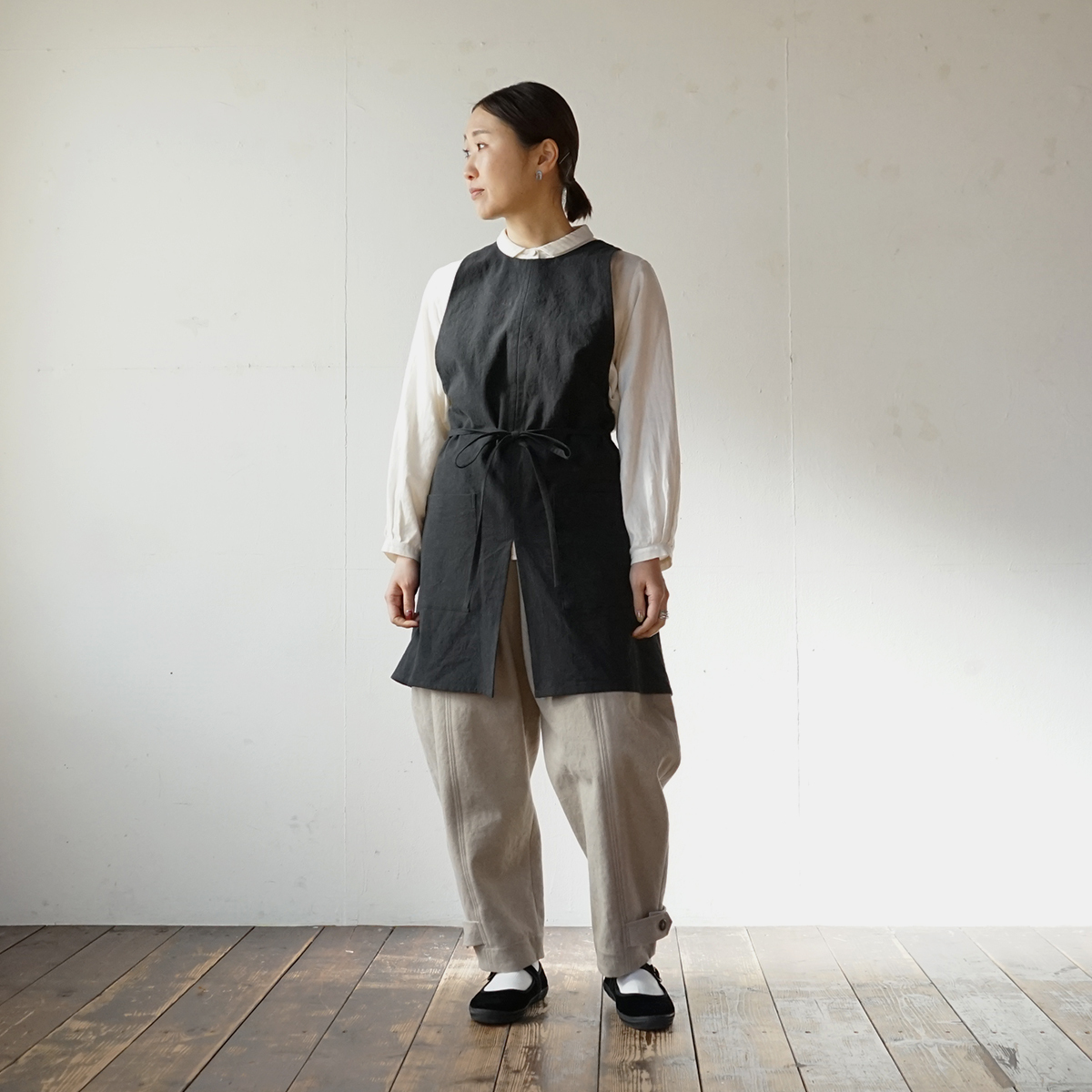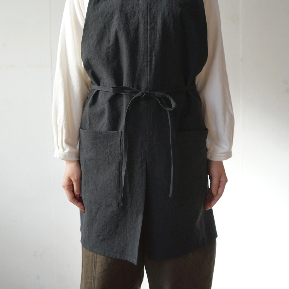 生地表面に粗野感のあるリネンコットンの生地を使って、ショートタイプのワークエプロンをつくりました