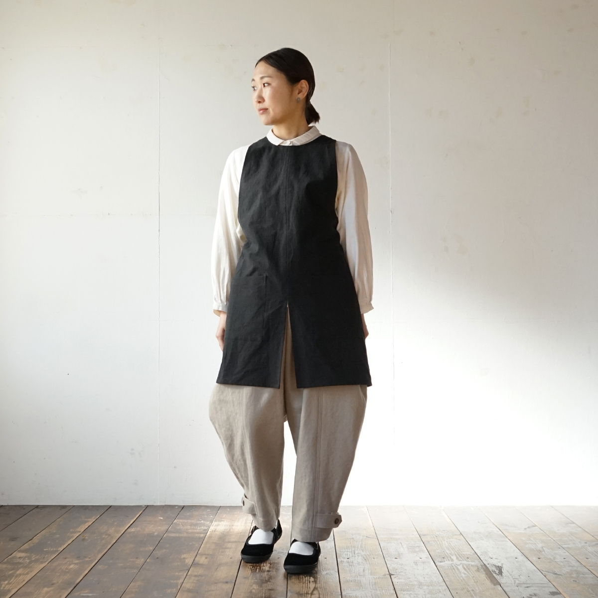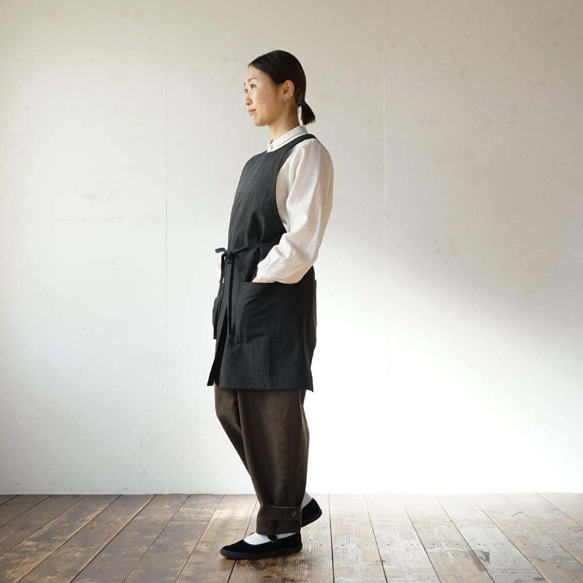 ショートタイプにしてなるべく軽く、座っても作業しやすいように裾中央にスリットを入れました。