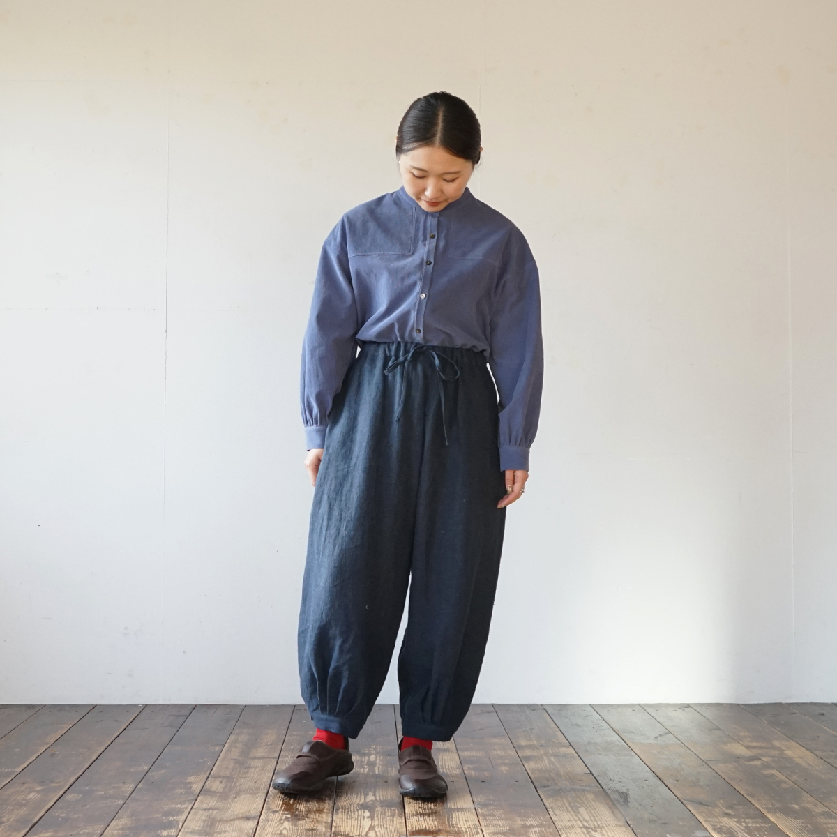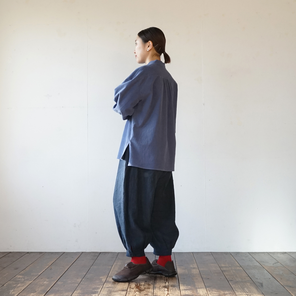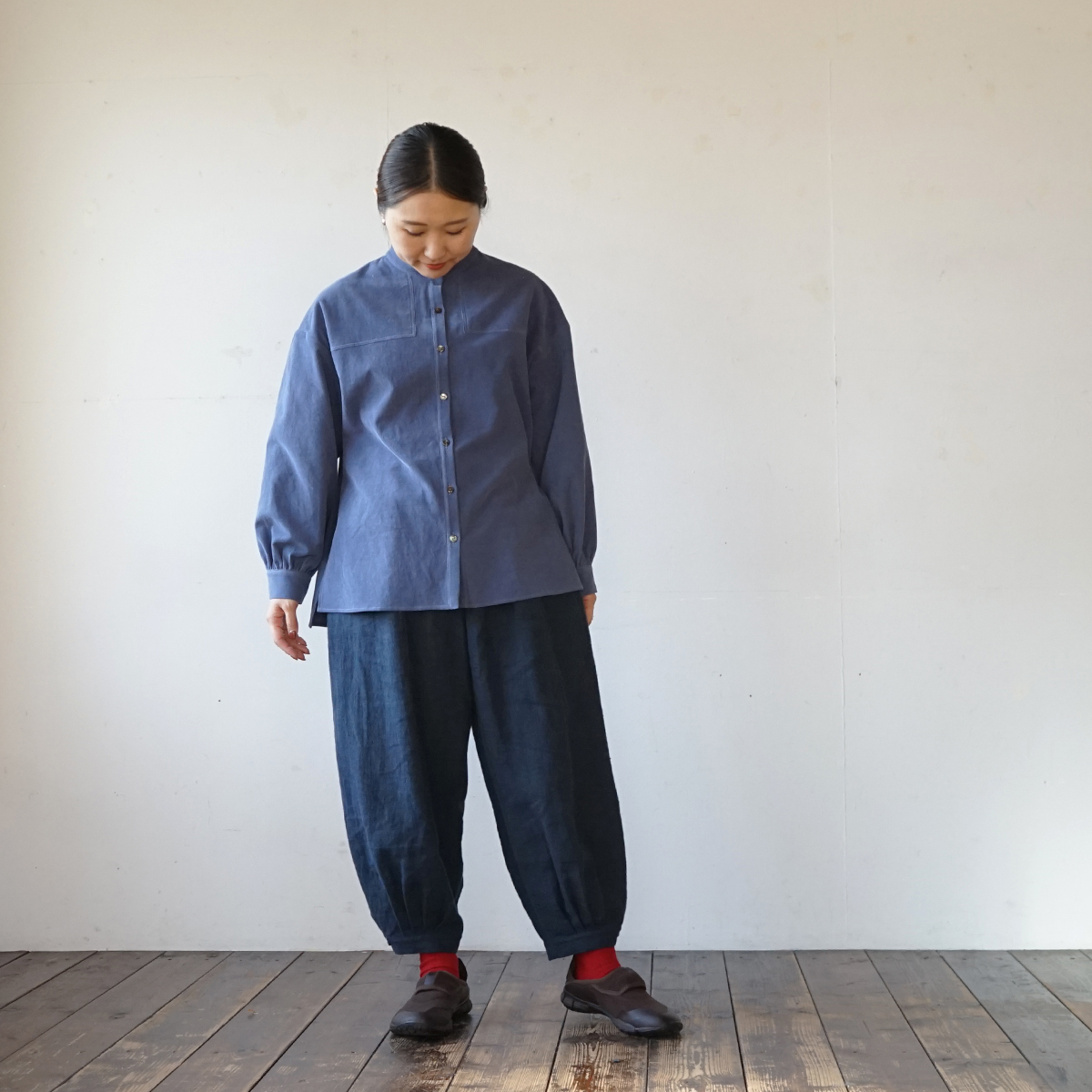 そのままだとメンズライクになりがちなシャツですが、袖口や後身頃にギャザーを寄せて、どちらともいえないような中立なデザインを心がけました。