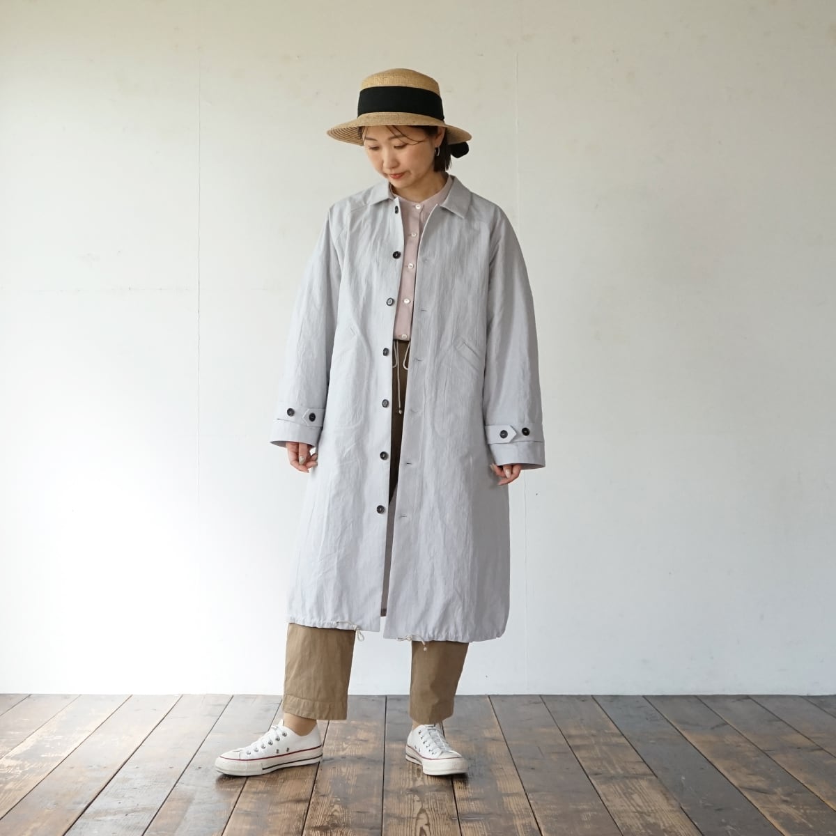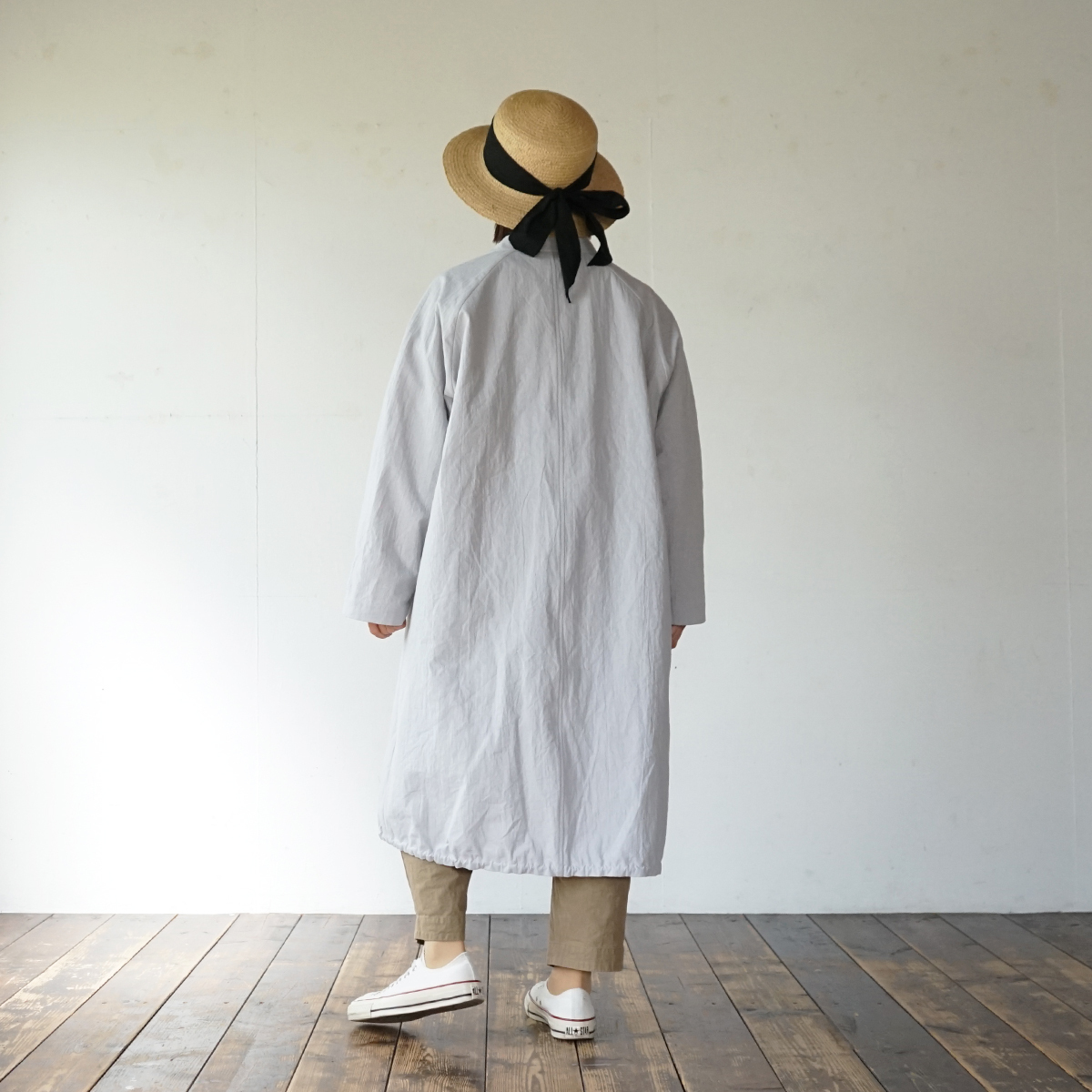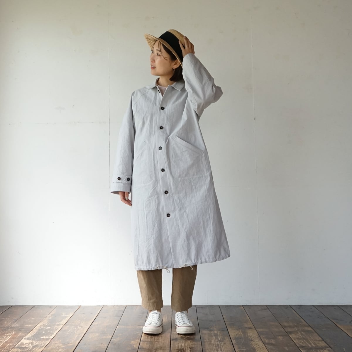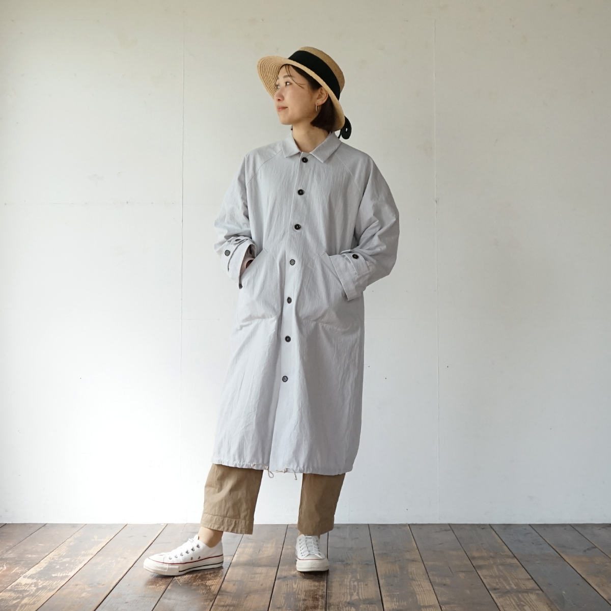 コットンヘンプ特有のしわ感と紙のような質感が特徴の生地を使って、ラグランコートを仕立てました。春にちょうど良い厚みの生地で、裏はつけておらず一枚仕立てです。