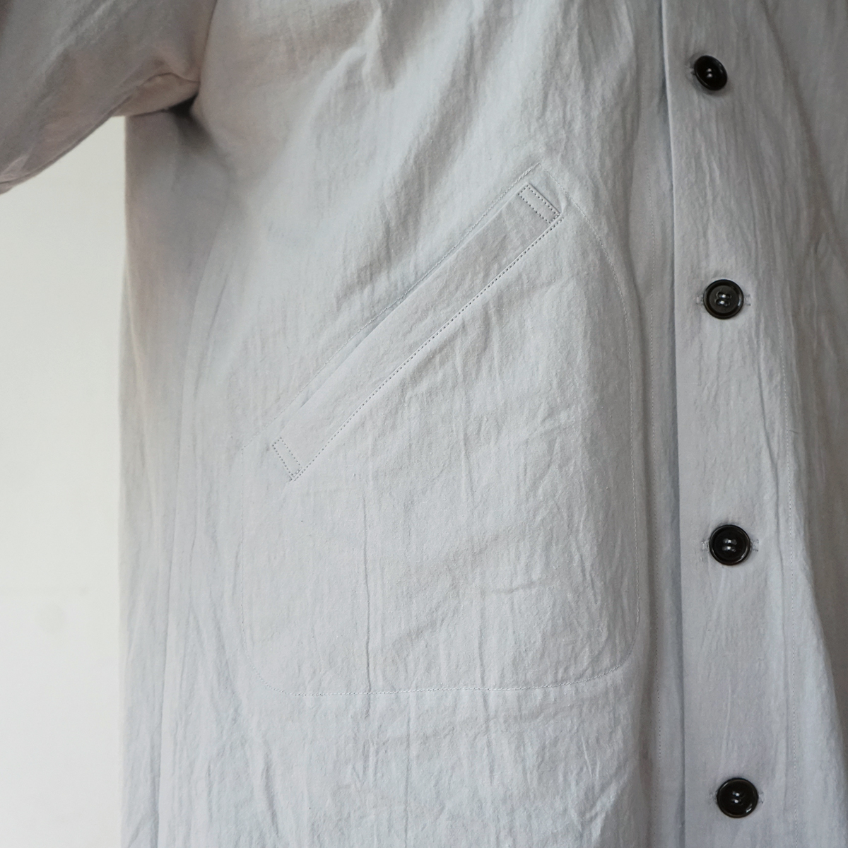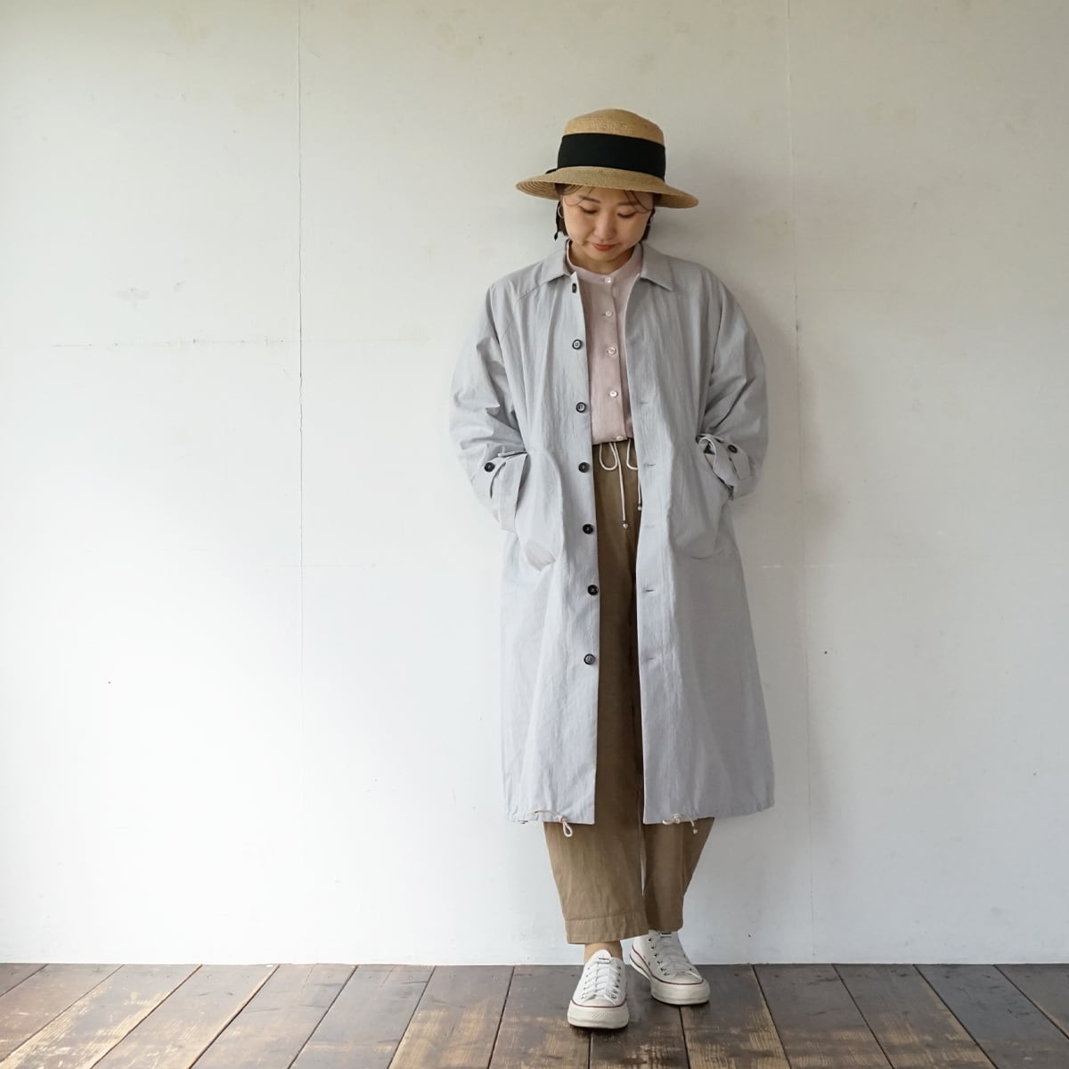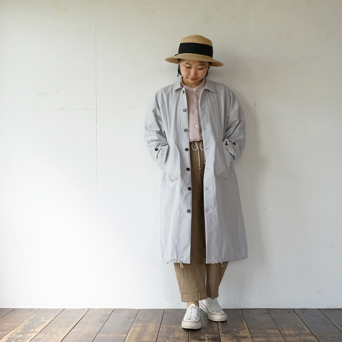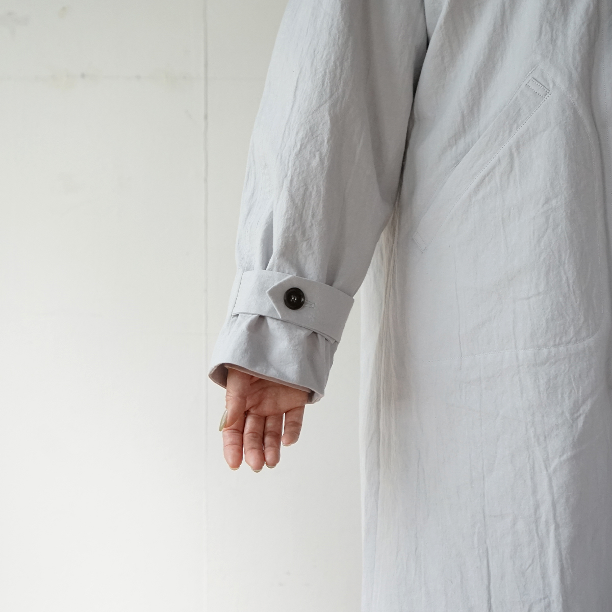 コットンヘンプ特有のしわ感と紙のような質感が特徴の生地を使って、ラグランコートを仕立てました。春にちょうど良い厚みの生地で、裏はつけておらず一枚仕立てです。