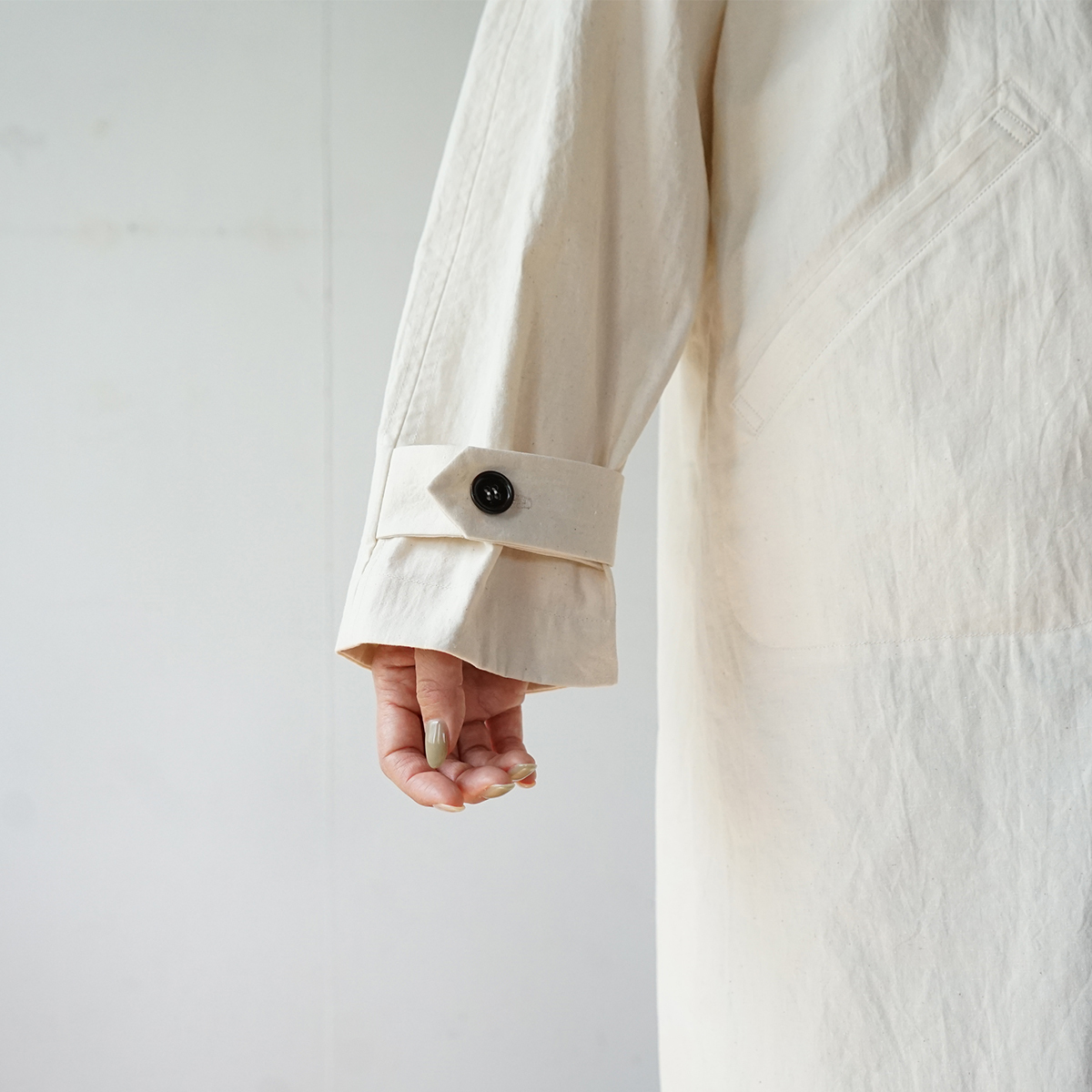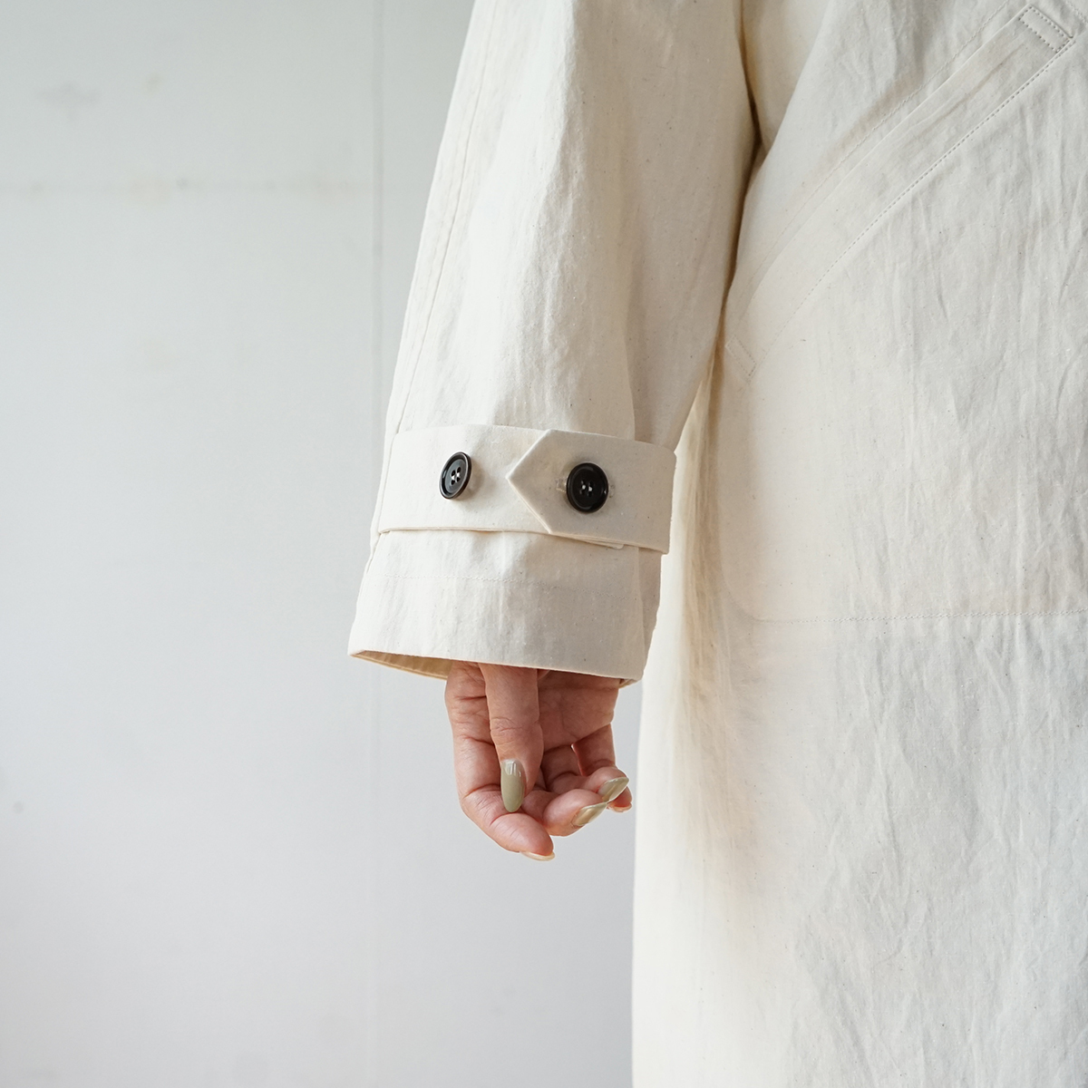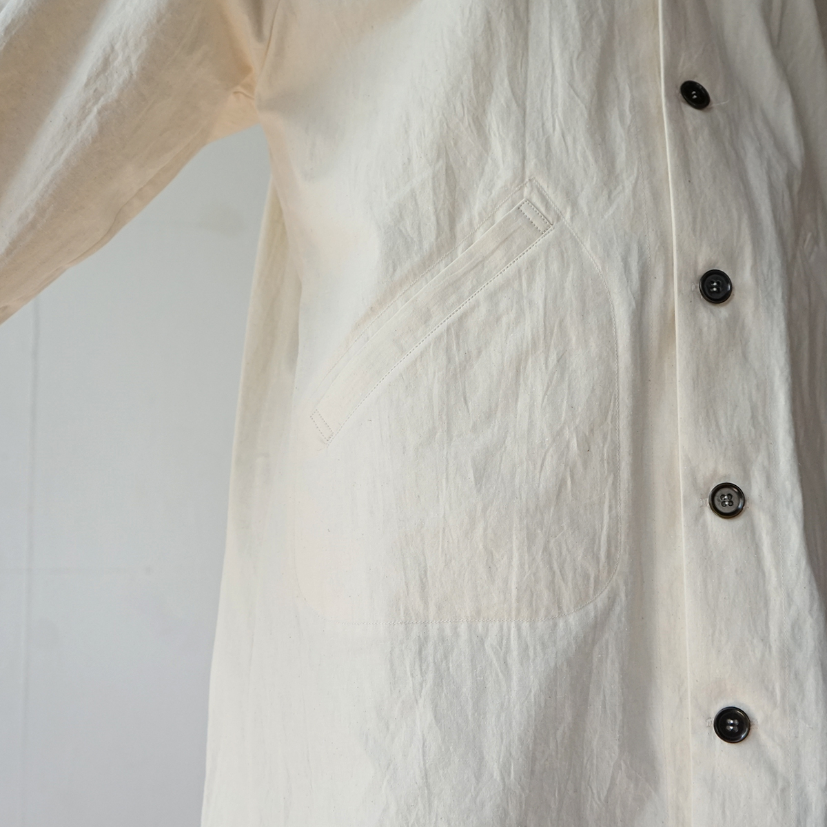 コットンヘンプ特有のしわ感と紙のような質感が特徴の生地を使って、ラグランコートを仕立てました。春にちょうど良い厚みの生地で、裏はつけておらず一枚仕立てです。