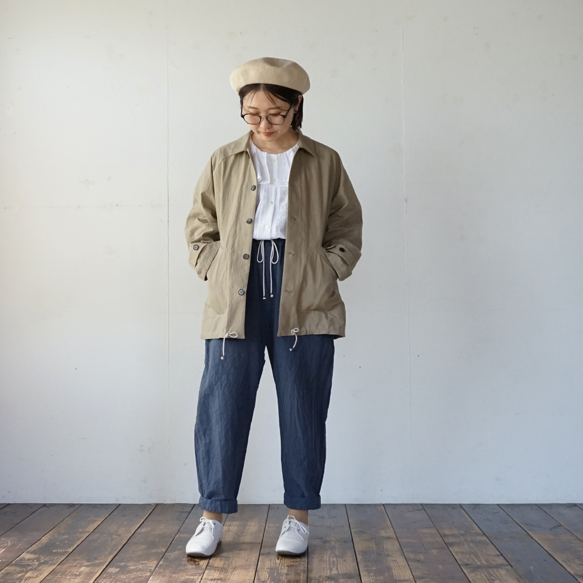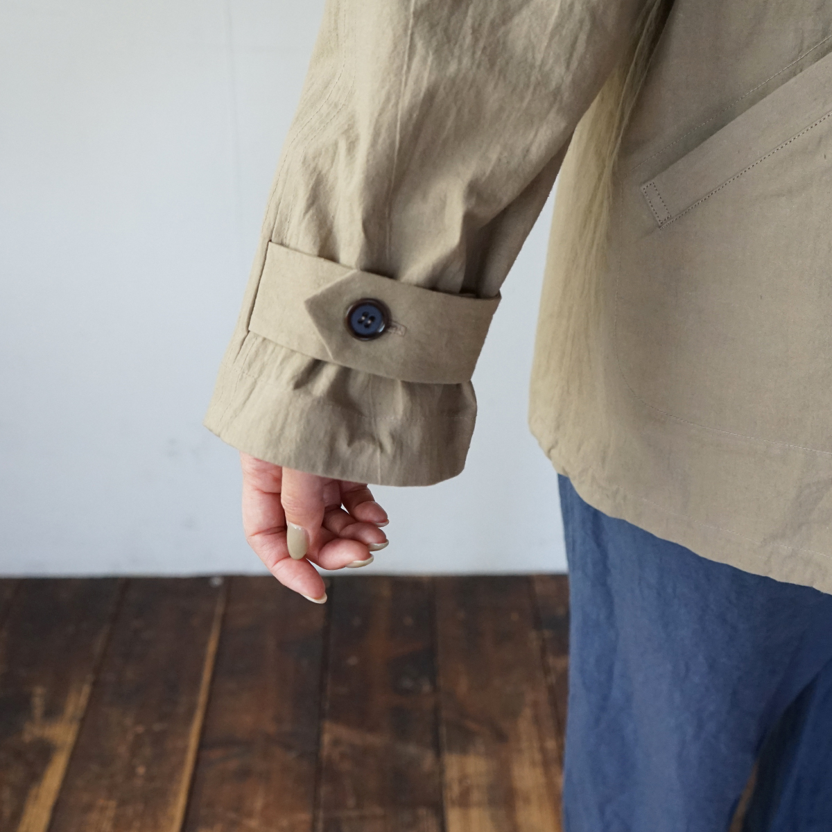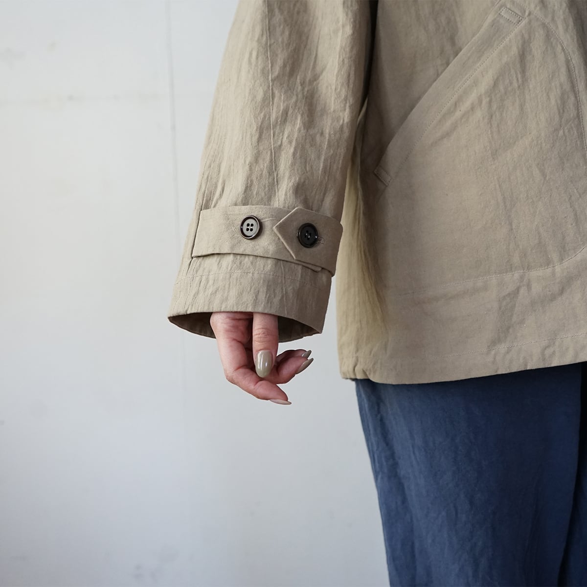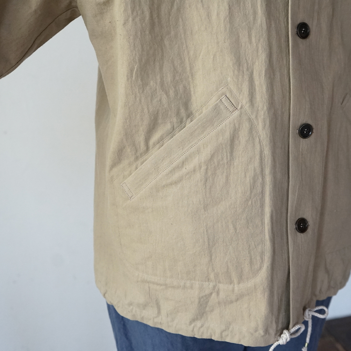 コットンヘンプ特有のしわ感と紙のような質感が特徴の生地を使って、ラグランブルゾンを仕立てました。春にちょうど良い厚みの生地で、裏はつけておらず一枚仕立てです。