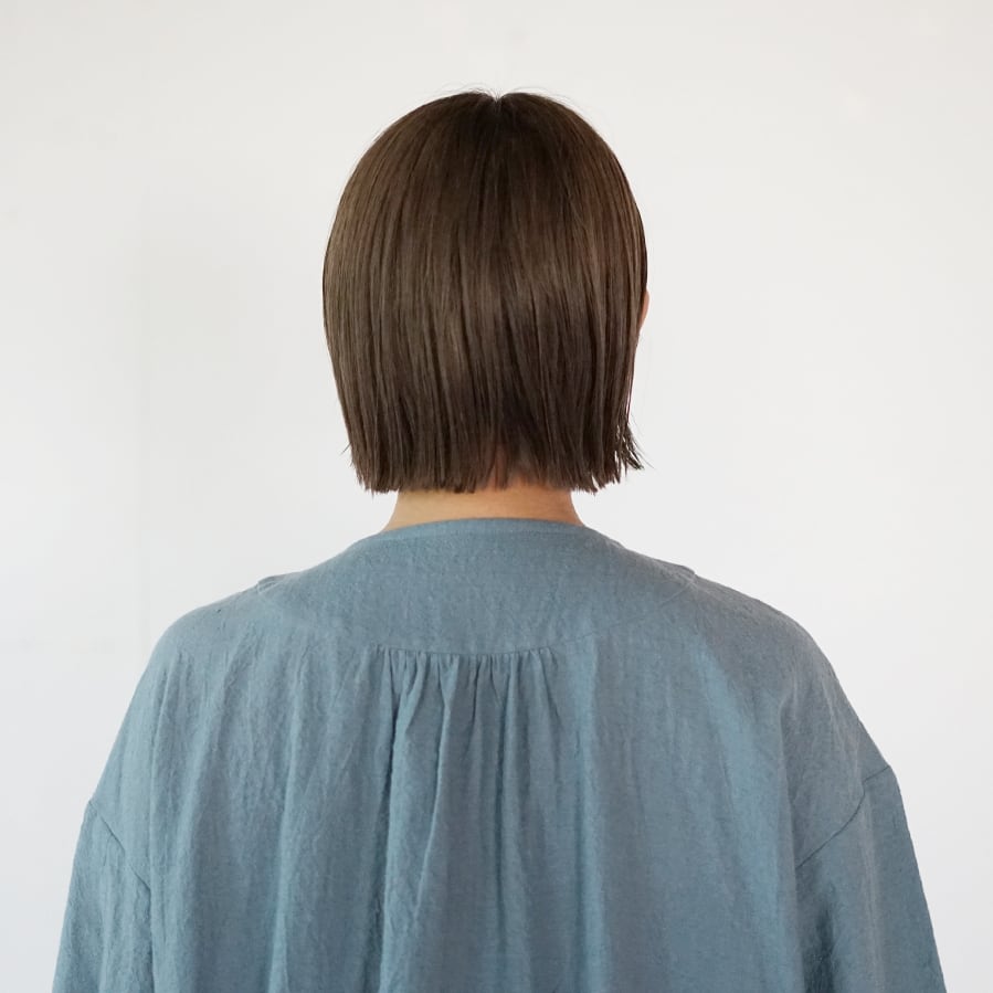 襟はノーカラーで、前後をラウンドーヨークで切り替えギャザーを寄せました。