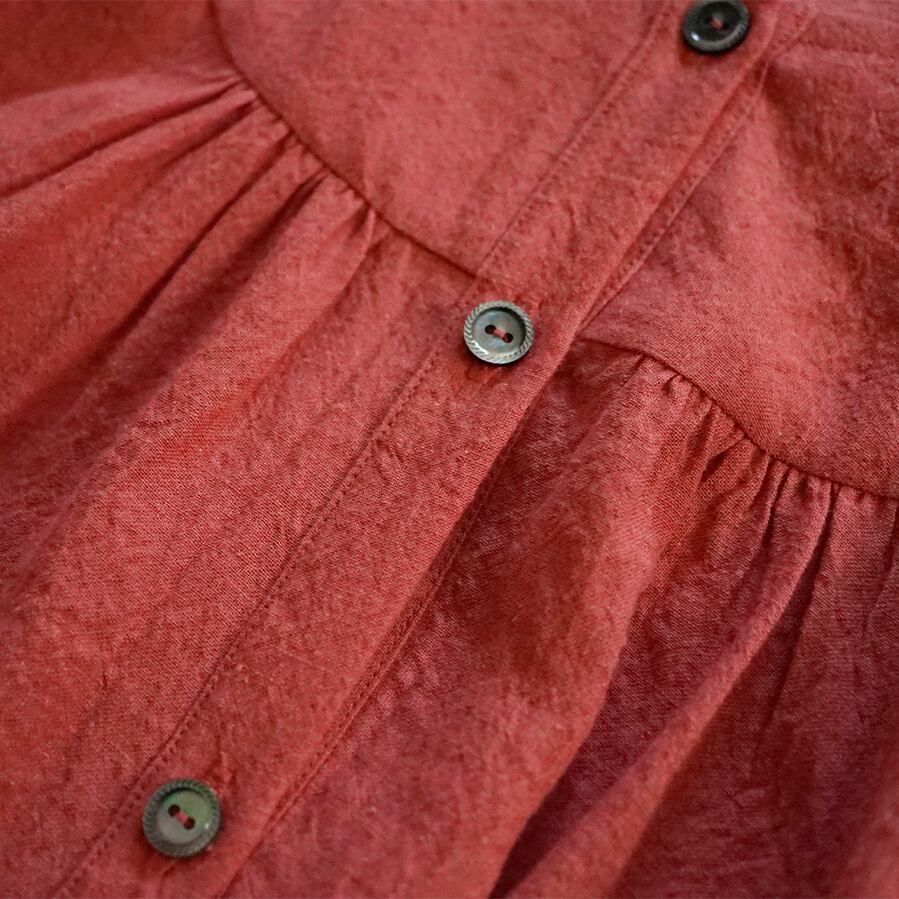 リネンやコットンは水に濡れると縮みやすいため、お洗濯後はしわを伸ばして陰干しし、乾いたら中アイロン(当て布あり)を当ててあげてください。敢えてしわを生かしてご着用いただくのもお楽しみいただけるポイントです。