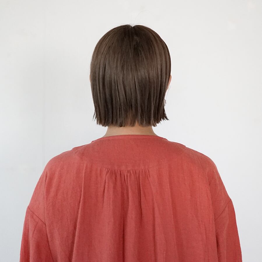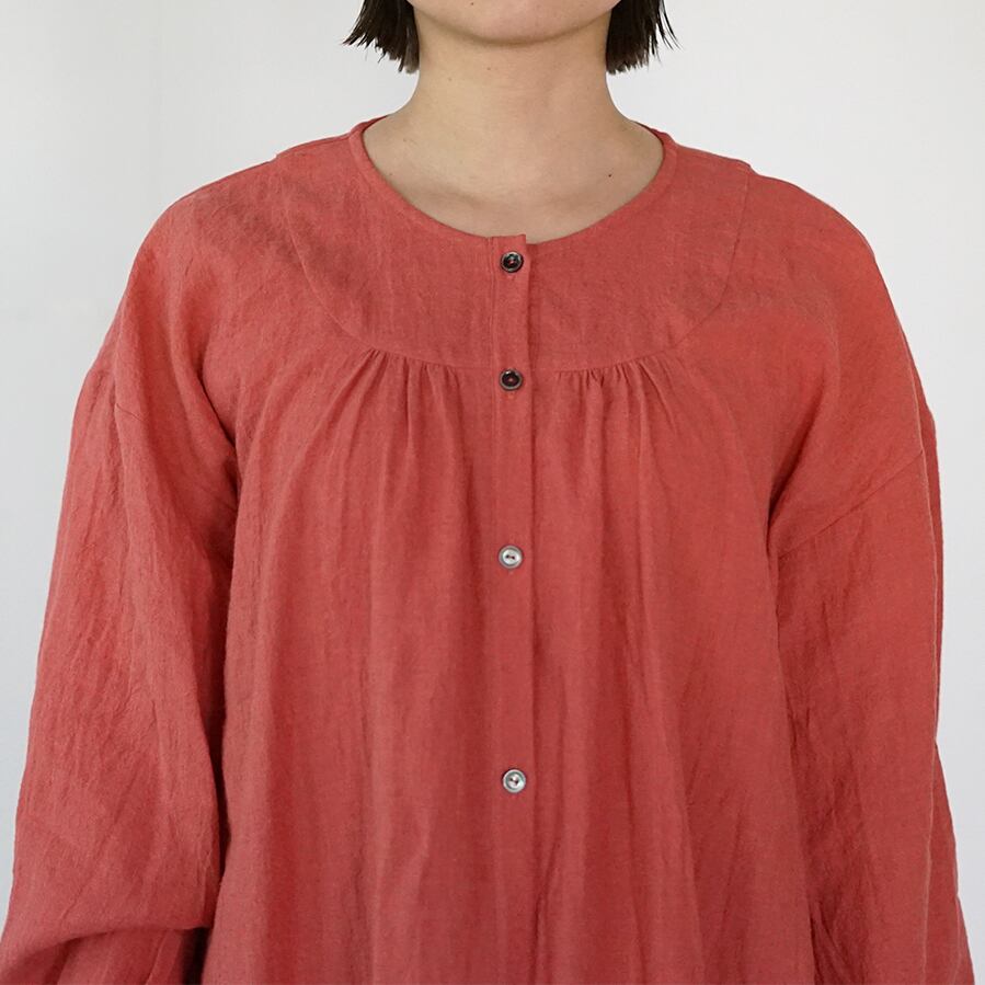 襟はノーカラーで、前後をラウンドーヨークで切り替えギャザーを寄せました。