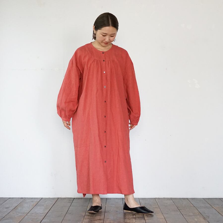 とても柔らかく肌触りの良いリネンコットン先染シャンブレー生地を使用したワンピース。ヨーク部分、袖口に広がり過ぎない程度のギャザーを寄せているので、ゆったりとした着心地です。