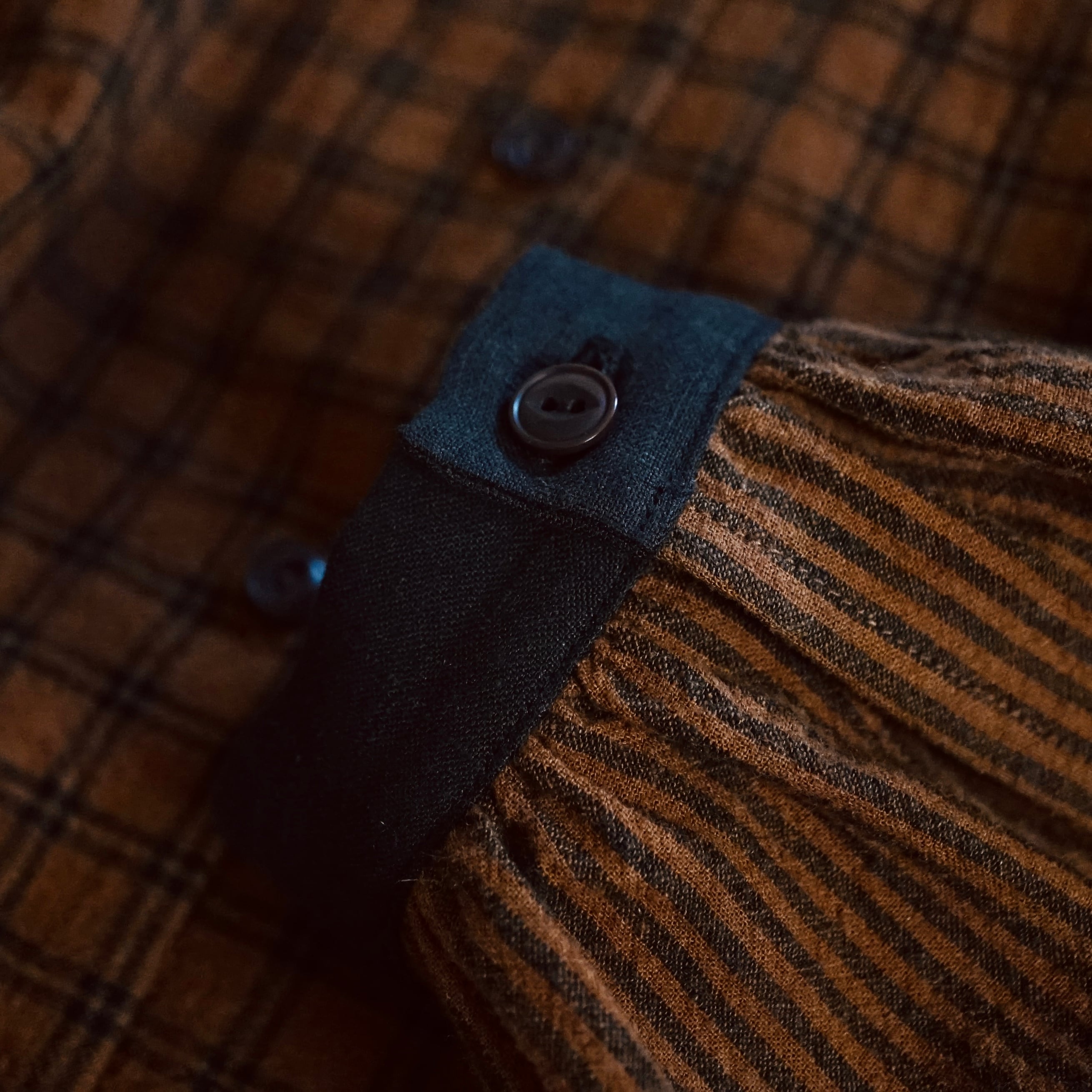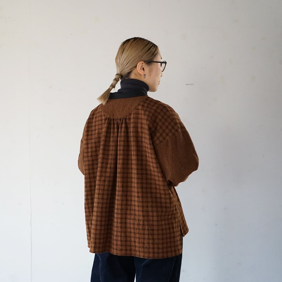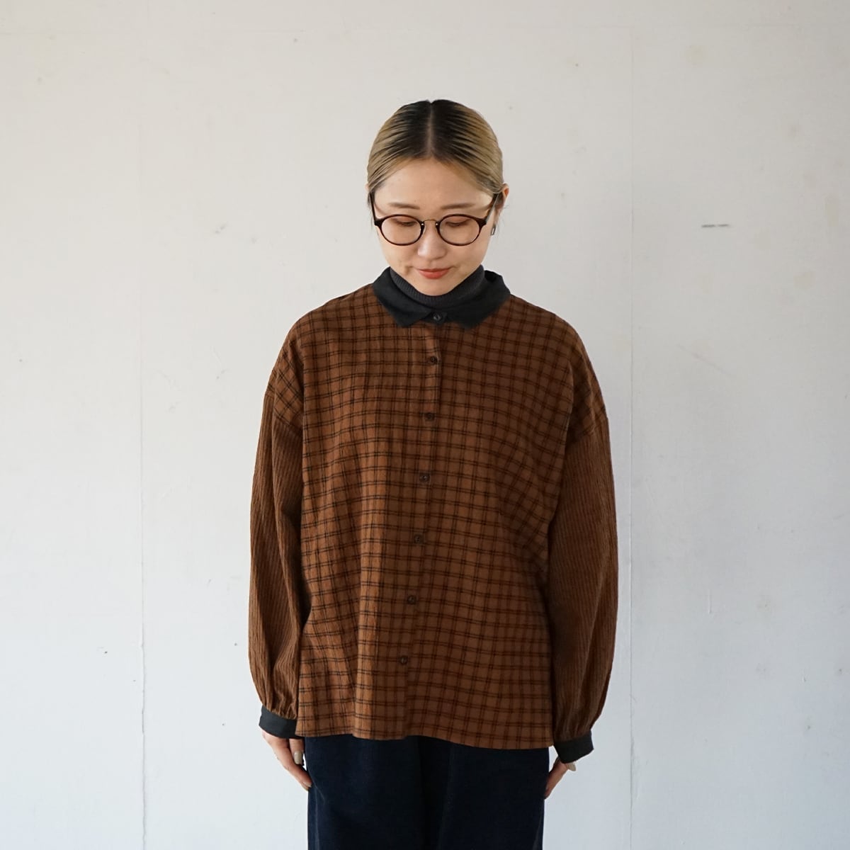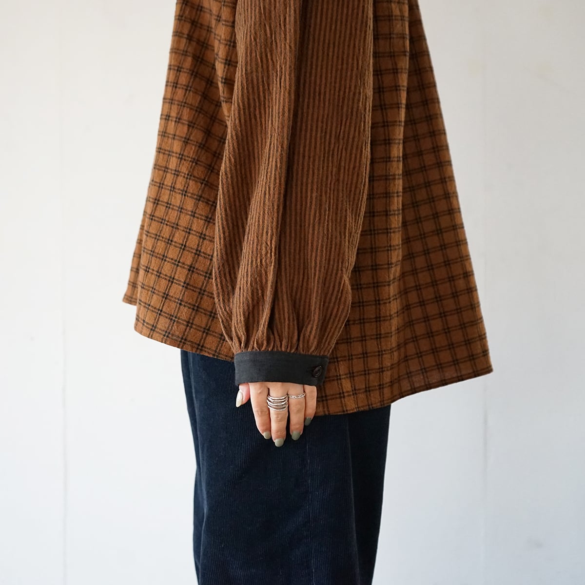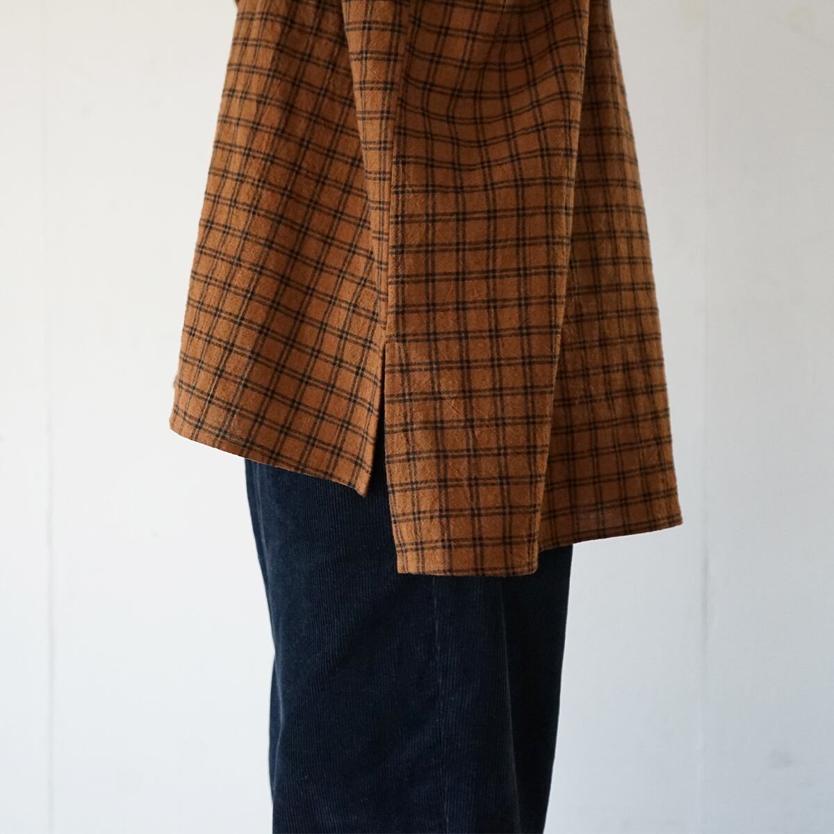 リネンコットンのチェック生地とストライプ生地をパーツ毎に変えて使ったシャツ。生地の厚みは薄過ぎず厚過ぎずで、表情豊かなシワ感が特徴です。春や秋にぴったりの生地ですが、冬は中にタートルなどを重ね着すると使っていただけます。